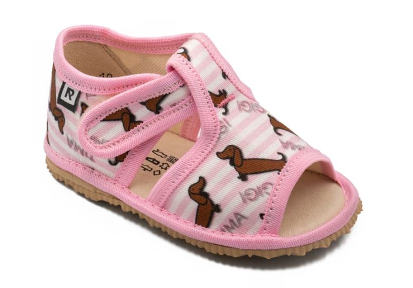 Papučky Rak sú z poctivej slovenskej dielne. Vyrábajú sa v rôznorodých farebných prevedeniach. Daný model je sandálkového strihu s otvorenou špicou so zapínaním na suchý zips, takže sa pekne prispôsobia členkom. Tvar špičky s dôrazom na typicky detský dominantný palček zabezpečuje dostatočný priestor pre prsty. Papučky sedia na širšie nôžky aj s mierne vyšším priehlavkom. Elastická stielka zvyšujúca komfort pri chôdzi je z kombinácie „pamäťovej“ peny a prírodnej podšívkovej ECO kože. Podrážka je pružná, ohybná, z materiálu na báze prírodného kaučuku s výrazným protišmykovým efektom aj na hladkých a lesklých povrchoch. Vďaka svojej pružnosti ich možno považovať za alternatívu barefootových papučiek.