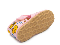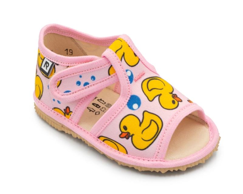 Papučky Rak sú z poctivej slovenskej dielne. Vyrábajú sa v rôznorodých farebných prevedeniach. Daný model je sandálkového strihu s otvorenou špicou so zapínaním na suchý zips, takže sa pekne prispôsobia členkom. Tvar špičky s dôrazom na typicky detský dominantný palček zabezpečuje dostatočný priestor pre prsty. Papučky sedia na širšie nôžky aj s mierne vyšším priehlavkom. Elastická stielka zvyšujúca komfort pri chôdzi je z kombinácie „pamäťovej“ peny a prírodnej podšívkovej ECO kože. Podrážka je pružná, ohybná, z materiálu na báze prírodného kaučuku s výrazným protišmykovým efektom aj na hladkých a lesklých povrchoch. Vďaka svojej pružnosti ich možno považovať za alternatívu barefootových papučiek.