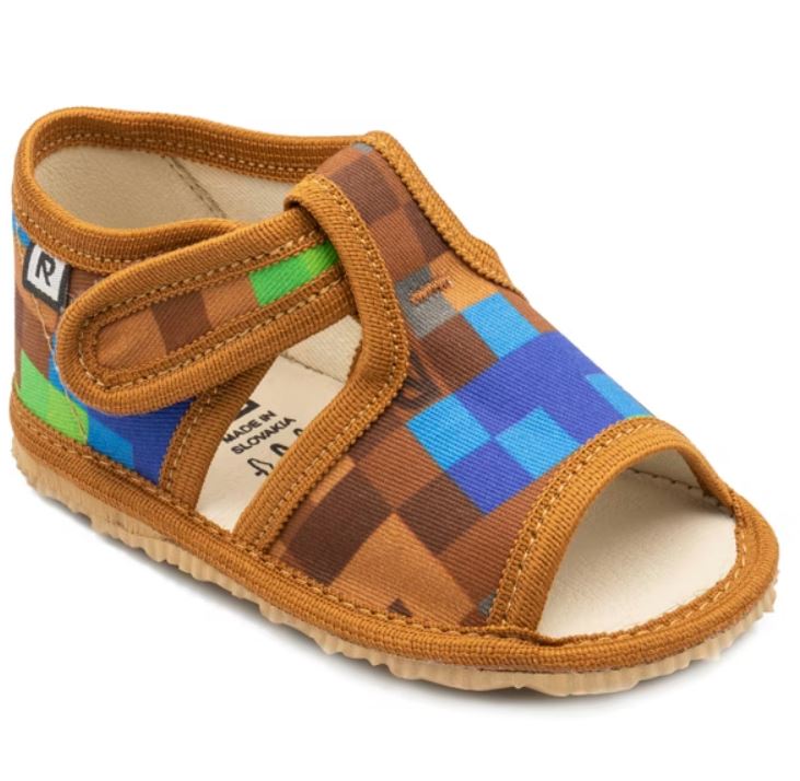 Papučky Rak sú z poctivej slovenskej dielne. Vyrábajú sa v rôznorodých farebných prevedeniach. Daný model je sandálkového strihu s otvorenou špicou so zapínaním na suchý zips, takže sa pekne prispôsobia členkom. Tvar špičky s dôrazom na typicky detský dominantný palček zabezpečuje dostatočný priestor pre prsty. Papučky sedia na širšie nôžky aj s mierne vyšším priehlavkom. Elastická stielka zvyšujúca komfort pri chôdzi je z kombinácie „pamäťovej“ peny a prírodnej podšívkovej ECO kože. Podrážka je pružná, ohybná, z materiálu na báze prírodného kaučuku s výrazným protišmykovým efektom aj na hladkých a lesklých povrchoch. Vďaka svojej pružnosti a tvaru, ich možno považovať za alternatívu barefootových papučiek.