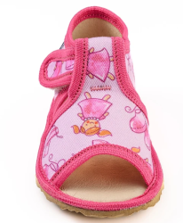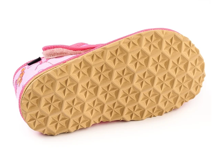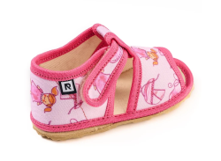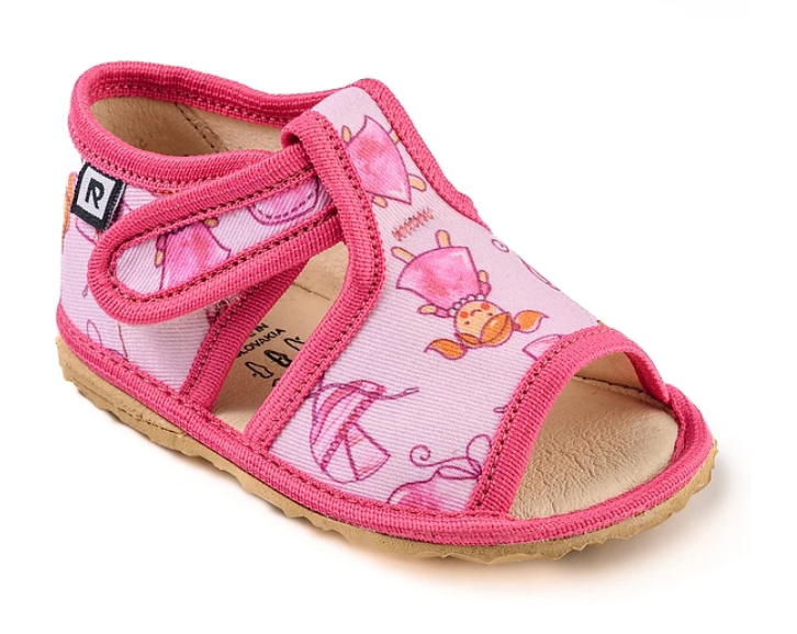 Papučky Rak sú z poctivej slovenskej dielne. Vyrábajú sa v rôznorodých farebných prevedeniach. Daný model je sandálkového strihu s otvorenou špicou so zapínaním na suchý zips, takže sa pekne prispôsobia členkom. Tvar špičky s dôrazom na typicky detský dominantný palček zabezpečuje dostatočný priestor pre prsty. Papučky sedia na širšie nôžky aj s mierne vyšším priehlavkom. Elastická stielka zvyšujúca komfort pri chôdzi je z kombinácie „pamäťovej“ peny a prírodnej podšívkovej ECO kože. Podrážka je pružná, ohybná, z materiálu na báze prírodného kaučuku s výrazným protišmykovým efektom aj na hladkých a lesklých povrchoch. Vďaka svojej pružnosti ich možno považovať za alternatívu barefootových papučiek.