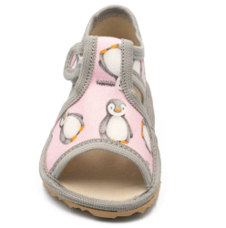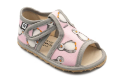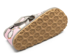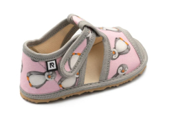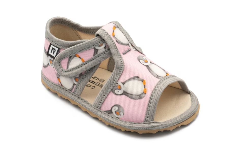 Flexi papučky Rak sú z poctivej slovenskej dielne. Vyrábajú sa v rôznych farebných prevedeniach a typoch. Daný model je sandálkového strihu s otvorenou špicou so zapínaním na suchý zips, takže sa pekne prispôsobia členkom. Tvar špičky s dôrazom na typicky detský dominantný palček zabezpečuje dostatočný priestor pre prsty. Papučky sedia na širšie nôžky aj s vyšším priehlavkom. Vhodné sú aj pre užšie pätičky. Výrazne flexibilná stielka zvyšujúca komfort pri chôdzi je z kombinácie elastickej latexovej peny a prírodnej podšívkovej ECO kože. Tenká (4 mm), ohybná podrážka je pružná, s podošvou s nulovým dropom (medzi pätou a špičkou nie je výškovo žiaden rozdiel, podrážka je teda úplne plochá a chodidlo je rovnako vysoko od zeme v päte aj špičke). Podrážka je vyrobená z materiálu na báze prírodného kaučuku s výrazným protišmykovým efektom aj na hladkých a lesklých povrchoch. Vďaka svojej pružnosti a strihu ich možno považovať za alternatívu barefootových papučiek.