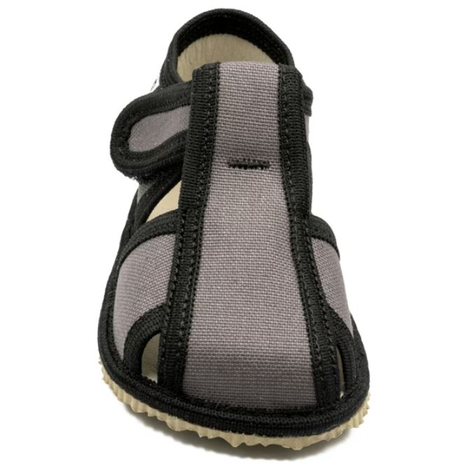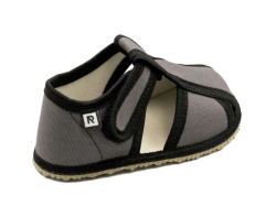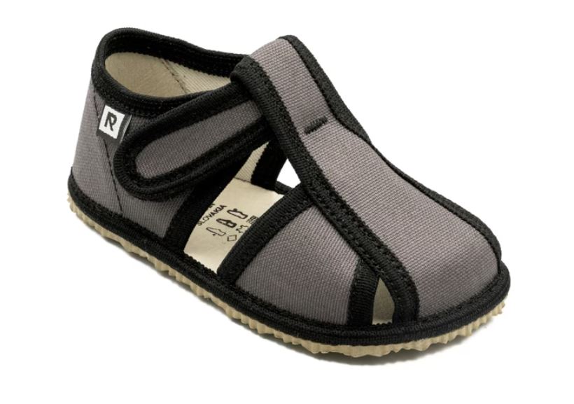 Flexi papučky Rak sú z poctivej slovenskej dielne. Vyrábajú sa v rôznych farebných prevedeniach a typoch. Daný model je sandálkového strihu so zatvorenou špicou so zapínaním na suchý zips, takže sa pekne prispôsobia členkom. Tvar špičky s dôrazom na typicky detský dominantný palček zabezpečuje dostatočný priestor pre prsty. Papučky sedia na širšie nôžky aj s vyšším priehlavkom. Vhodné sú aj pre užšie pätičky. Výrazne flexibilná stielka zvyšujúca komfort pri chôdzi je z kombinácie elastickej latexovej peny a prírodnej podšívkovej ECO kože. Tenká (4 mm), ohybná podrážka je pružná, s podošvou s nulovým dropom (medzi pätou a špičkou nie je výškovo žiaden rozdiel, podrážka je teda úplne plochá a chodidlo je rovnako vysoko od zeme v päte aj špičke). Podrážka je vyrobená z materiálu na báze prírodného kaučuku s výrazným protišmykovým efektom aj na hladkých a lesklých povrchoch. Vďaka svojej pružnosti a strihu ich možno považovať za alternatívu barefootových papučiek.