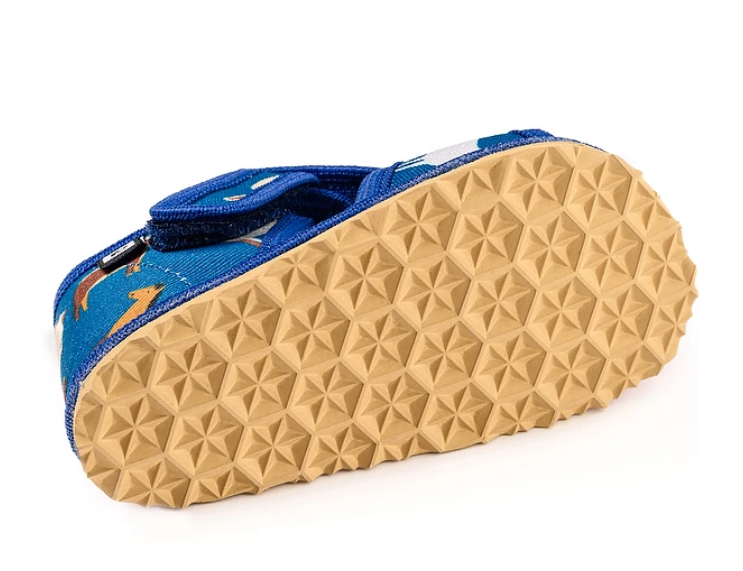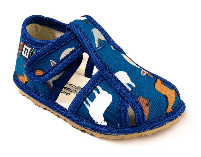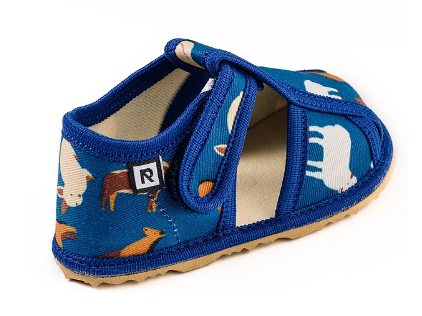 Flexi papučky Rak sú z poctivej slovenskej dielne. Vyrábajú sa v rôznych farebných prevedeniach a typoch. Daný model je sandálkového strihu so zatvorenou špicou so zapínaním na suchý zips, takže sa pekne prispôsobia členkom. Tvar špičky s dôrazom na typicky detský dominantný palček zabezpečuje dostatočný priestor pre prsty. Papučky sedia na širšie nôžky aj s vyšším priehlavkom. Vhodné sú aj pre užšie pätičky. Výrazne flexibilná stielka zvyšujúca komfort pri chôdzi je z kombinácie elastickej latexovej peny a prírodnej podšívkovej ECO kože. Tenká (4 mm), ohybná podrážka je pružná, s podošvou s nulovým dropom (medzi pätou a špičkou nie je výškovo žiaden rozdiel, podrážka je teda úplne plochá a chodidlo je rovnako vysoko od zeme v päte aj špičke). Podrážka je vyrobená z materiálu na báze prírodného kaučuku s výrazným protišmykovým efektom aj na hladkých a lesklých povrchoch. Vďaka svojej pružnosti a strihu ich možno považovať za alternatívu barefootových papučiek.