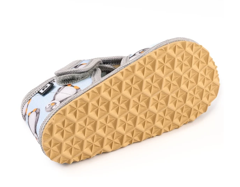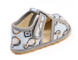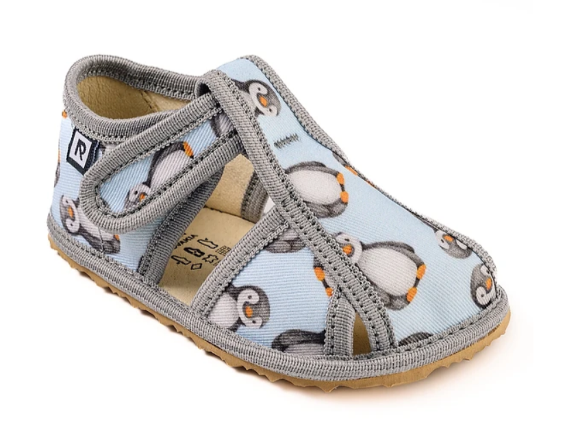 Flexi papučky Rak sú z poctivej slovenskej dielne. Vyrábajú sa v rôznych farebných prevedeniach a typoch. Daný model je sandálkového strihu so zatvorenou špicou so zapínaním na suchý zips, takže sa pekne prispôsobia členkom. Tvar špičky s dôrazom na typicky detský dominantný palček zabezpečuje dostatočný priestor pre prsty. Papučky sedia na širšie nôžky aj s vyšším priehlavkom. Vhodné sú aj pre užšie pätičky. Výrazne flexibilná stielka zvyšujúca komfort pri chôdzi je z kombinácie elastickej latexovej peny a prírodnej podšívkovej ECO kože. Tenká (4 mm), ohybná podrážka je pružná, s podošvou s nulovým dropom (medzi pätou a špičkou nie je výškovo žiaden rozdiel, podrážka je teda úplne plochá a chodidlo je rovnako vysoko od zeme v päte aj špičke). Podrážka je vyrobená z materiálu na báze prírodného kaučuku s výrazným protišmykovým efektom aj na hladkých a lesklých povrchoch. Vďaka svojej pružnosti a strihu ich možno považovať za alternatívu barefootových papučiek.