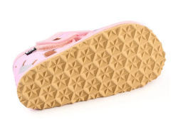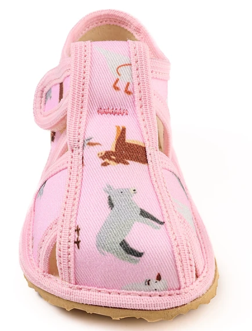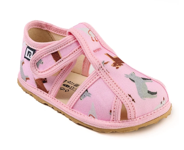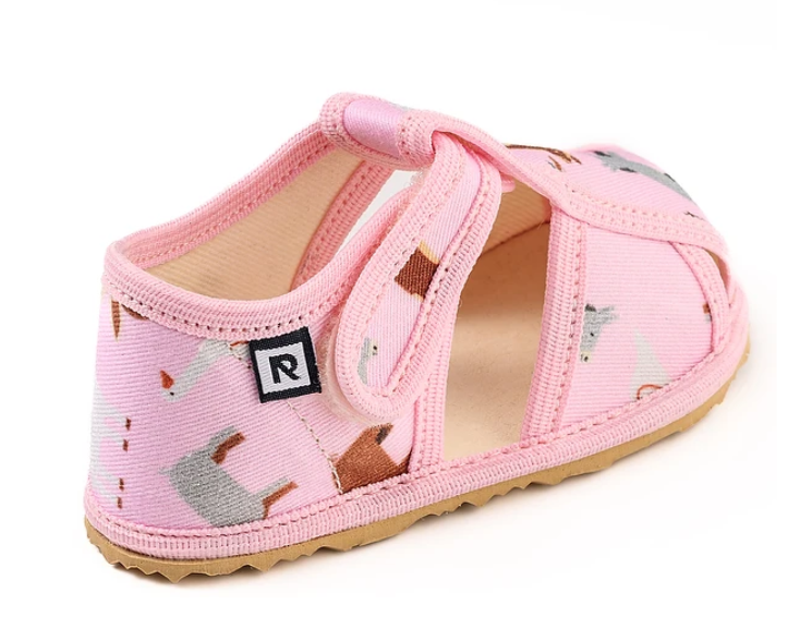 Flexi papučky Rak sú z poctivej slovenskej dielne. Vyrábajú sa v rôznych farebných prevedeniach a typoch. Daný model je sandálkového strihu so zatvorenou špicou so zapínaním na suchý zips, takže sa pekne prispôsobia členkom. Tvar špičky s dôrazom na typicky detský dominantný palček zabezpečuje dostatočný priestor pre prsty. Papučky sedia na širšie nôžky aj s vyšším priehlavkom. Vhodné sú aj pre užšie pätičky. Výrazne flexibilná stielka zvyšujúca komfort pri chôdzi je z kombinácie elastickej latexovej peny a prírodnej podšívkovej ECO kože. Tenká (4 mm), ohybná podrážka je pružná, s podošvou s nulovým dropom (medzi pätou a špičkou nie je výškovo žiaden rozdiel, podrážka je teda úplne plochá a chodidlo je rovnako vysoko od zeme v päte aj špičke). Podrážka je vyrobená z materiálu na báze prírodného kaučuku s výrazným protišmykovým efektom aj na hladkých a lesklých povrchoch. Vďaka svojej pružnosti a strihu ich možno považovať za alternatívu barefootových papučiek.