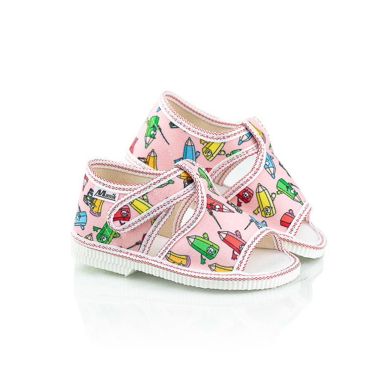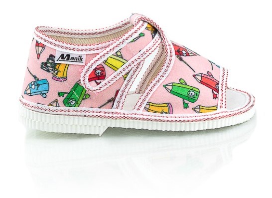 Papučky Manik sú z poctivej slovenskej dielne. Vyrábajú sa v rôznych farebných kombináciách a prevedeniach. Papučky sú sandálkového strihu s otvorenou špicou so zapínaním na suchý zips, takže sa pekne prispôsobia členkom. Sedia na normálne široké až užšie nôžky. Papučky sú ľahučké, majú výraznejšie tvarovanú klenbu a vďaka pevnejšej látke krásne detičkám sedia.