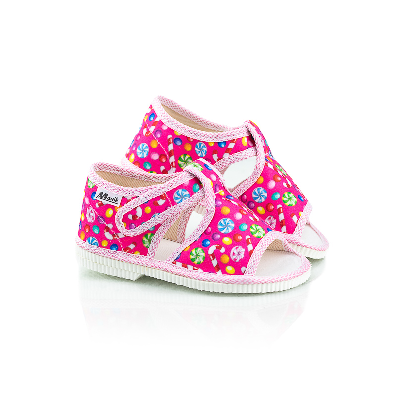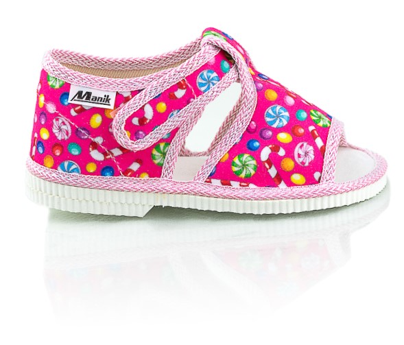 Papučky Manik sú z poctivej slovenskej dielne. Vyrábajú sa v rôznych farebných kombináciách a prevedeniach. Papučky sú  sandálkového strihu s otvorenou špicou so zapínaním na suchý zips, takže sa pekne prispôsobia členkom. Sedia na normálne široké až užšie nôžky. Papučky sú ľahučké, majú výraznejšie tvarovanú klenbu a vďaka pevnejšej látke krásne detičkám sedia.