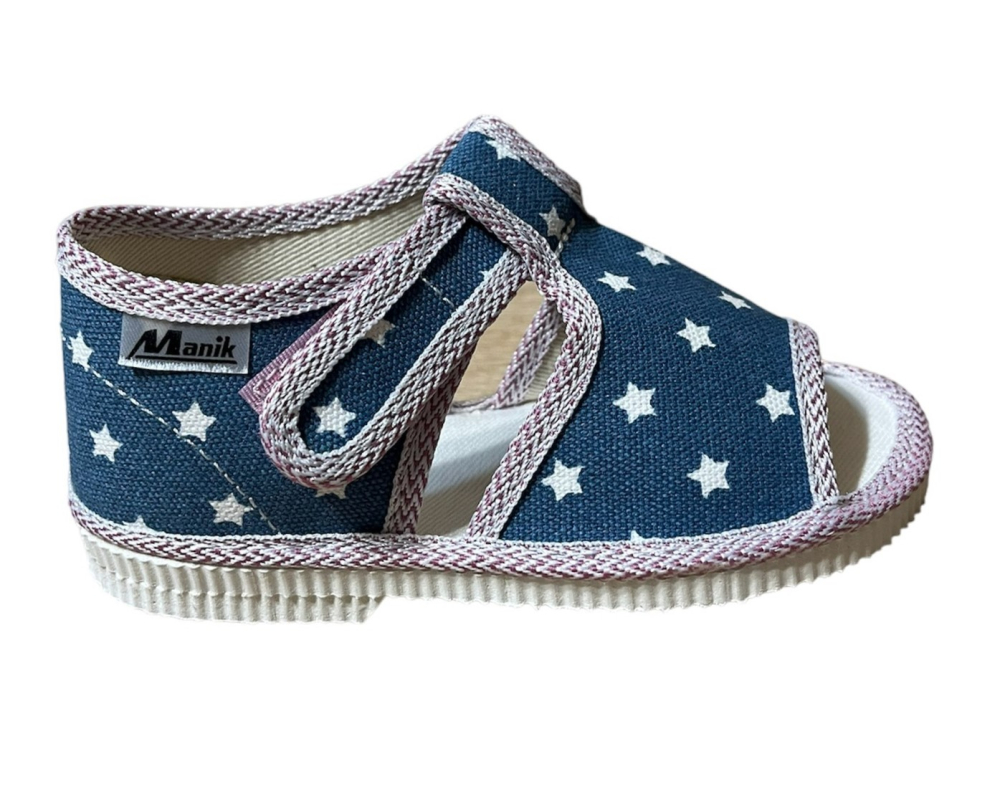 Papučky Manik sú z poctivej slovenskej dielne. Vyrábajú sa v rôznych farebných kombináciách a prevedeniach. Papučky sú sandálkového strihu s otvorenou špicou so zapínaním na suchý zips, takže sa pekne prispôsobia členkom. Sedia na normálne široké až užšie nôžky. Papučky sú ľahučké, majú výraznejšie tvarovanú klenbu a vďaka pevnejšej látke krásne detičkám sedia.