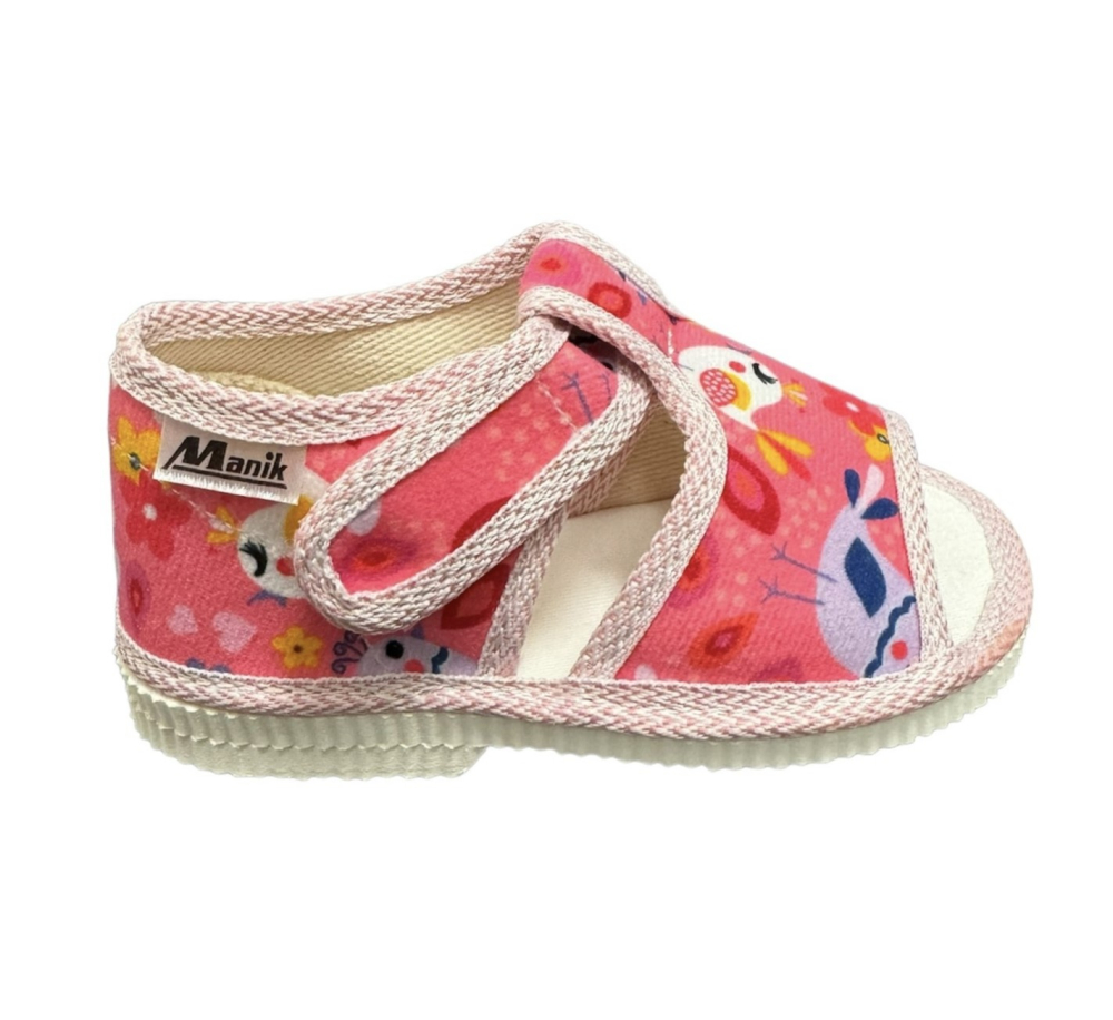 Papučky Manik sú z poctivej slovenskej dielne. Vyrábajú sa v rôznych farebných kombináciách a prevedeniach. Papučky sú sandálkového strihu s otvorenou špicou so zapínaním na suchý zips, takže sa pekne prispôsobia členkom. Sedia na normálne široké až užšie nôžky. Papučky sú ľahučké, majú výraznejšie tvarovanú klenbu a vďaka pevnejšej látke krásne detičkám sedia.