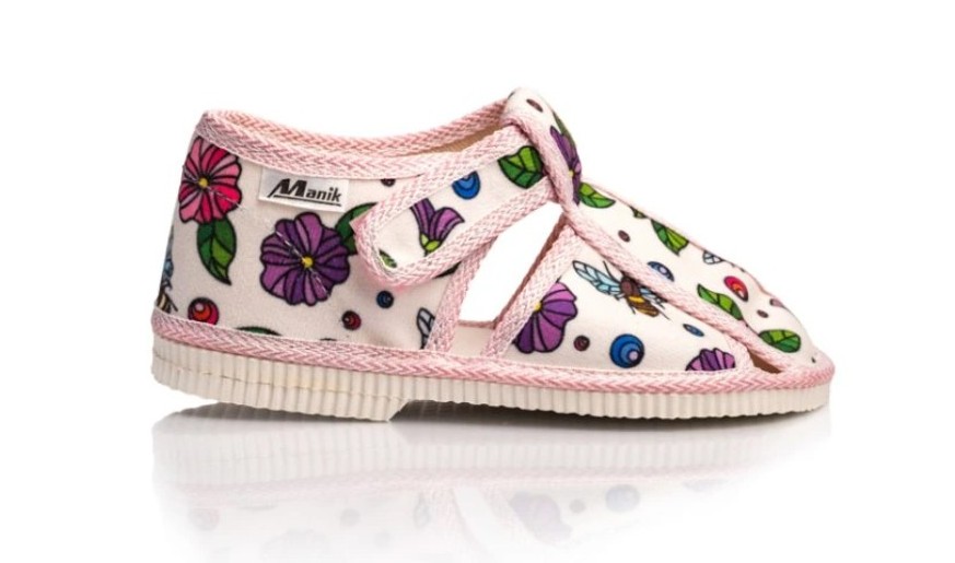 Papučky Manik sú z poctivej slovenskej dielne. Vyrábajú sa v rôznych farebných kombináciách a prevedeniach. Papučky sú sandálkového strihu so zatvorenou špicou so zapínaním na suchý zips, takže sa pekne prispôsobia členkom. Sedia na normálne široké až užšie nôžky. Papučky sú ľahučké, majú výraznejšie tvarovanú klenbu a vďaka pevnejšej látke krásne detičkám sedia.