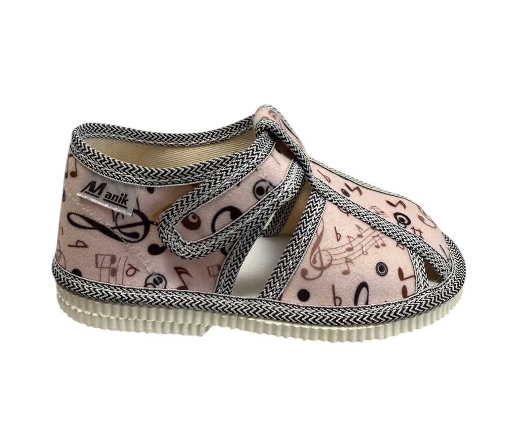 Papučky Manik sú z poctivej slovenskej dielne. Vyrábajú sa v rôznych farebných kombináciách a prevedeniach. Papučky sú sandálkového strihu so zatvorenou špicou so zapínaním na suchý zips, takže sa pekne prispôsobia členkom. Sedia na normálne široké až užšie nôžky. Papučky sú ľahučké, majú výraznejšie tvarovanú klenbu a vďaka pevnejšej látke krásne detičkám sedia.