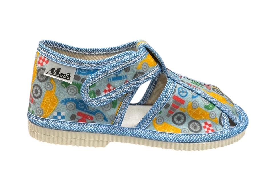 Papučky Manik sú z poctivej slovenskej dielne. Vyrábajú sa v rôznych farebných kombináciách a prevedeniach. Papučky sú sandálkového strihu so zatvorenou špicou so zapínaním na suchý zips, takže sa pekne prispôsobia členkom. Sedia na normálne široké až užšie nôžky. Papučky sú ľahučké a vďaka pevnejšej látke krásne detičkám sedia.