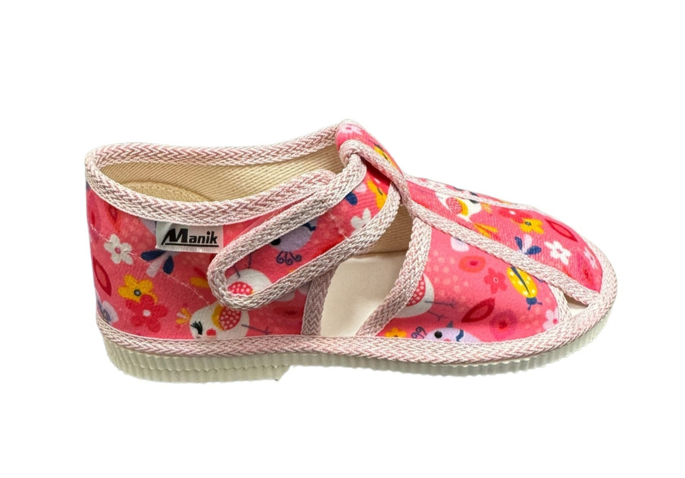 Papučky Manik sú z poctivej slovenskej dielne. Vyrábajú sa v rôznych farebných kombináciách a prevedeniach. Papučky sú sandálkového strihu so zatvorenou špicou so zapínaním na suchý zips, takže sa pekne prispôsobia členkom. Sedia na normálne široké až užšie nôžky. Papučky sú ľahučké a vďaka pevnejšej látke krásne detičkám sedia.