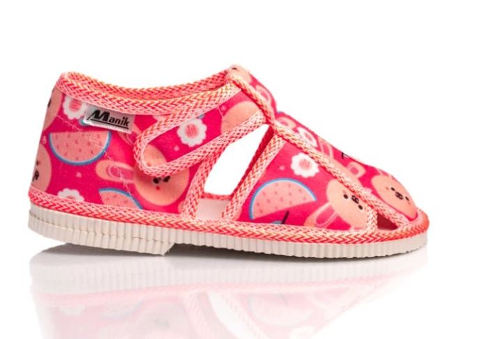 Papučky Manik sú z poctivej slovenskej dielne. Vyrábajú sa v rôznych farebných kombináciách a prevedeniach. Papučky sú sandálkového strihu so zatvorenou špicou so zapínaním na suchý zips, takže sa pekne prispôsobia členkom. Sedia na normálne široké až užšie nôžky. Papučky sú ľahučké a vďaka pevnejšej látke krásne detičkám sedia.