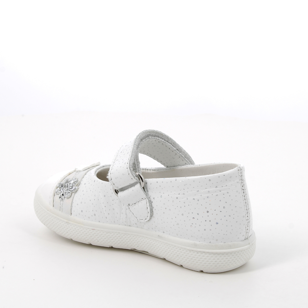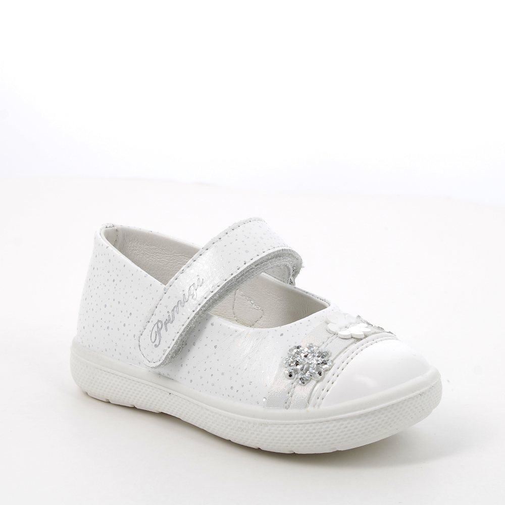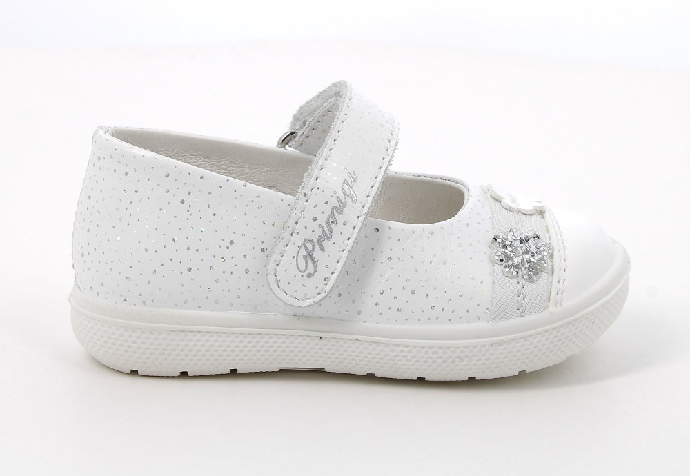 Ľahké, štýlové balerínky od talianskej značky Primigi v striebornobielom prevedení. Majú spevnenú pätu, vďaka čomu pekne držia nôžku a mäkkú, ohybnú špičku. Sedia na normálne široké nôžky. Vo vnútri sa nachádza kožená, mierne tvarovaná, vyberateľná stielka. Nohy v balerínkach v oblasti členku upevňuje suchý zips. Jemný dievčenský dizajn je vhodný aj pre príležitosť svadby či osláv.
