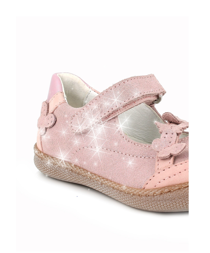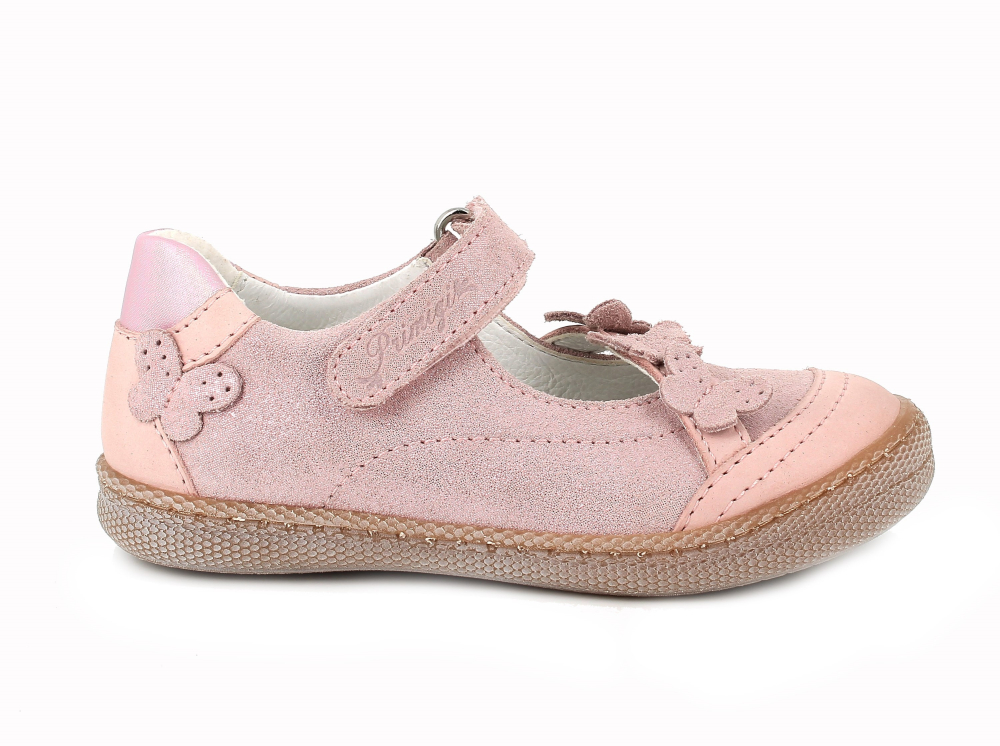 Ľahké, štýlové balerínky od talianskej značky Primigi. Majú spevnenú pätu, vďaka čomu pekne držia nôžku a mäkkú, ohybnú špičku. Vo vnútri sa nachádza kožená, mierne tvarovaná, vyberateľná stielka. Sedia na normálne široké nohy a vďaka elastickej gumičke v prednej časti aj na mierne vyšší priehlavok. Nohy v oblasti členku upevňuje suchý zips. Koža na povrchu je potiahnutá trblietkami s odleskami. Výhodou je aj praktická, vyvýšená, pogumovaná špica, ktorá chráni topánočky pred okopaním, čím sa predlžuje ich životnosť.