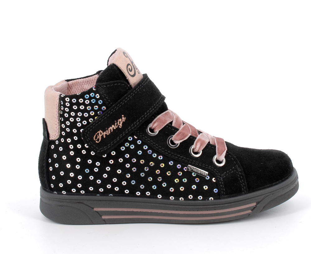 Štýlové, vysoké tenisky od talianskej značky Primigi s nepremokavou Gore-tex membránou, ktorá ochráni topánočky bez dodatočnej impregnácie pred dažďom a vlhkosťou. Tenisky sedia na normálne široké nôžky. Sú maximálne pohodlné a to vďaka technológii Primigi Shock Absorber- podrážka v oblasti päty podporuje odpruženie a preto skvele tlmí otrasy pri chôdzi. Topánočky majú v oblasti členku zapínanie na suchý zips, prispôsobia sa tak aj užšej nôžke a upevnia ju v topánke. Elastická šnurovačka v prednej časti tenisiek je okrasná, netreba ju viazať. Stielka je vyberateľná. Topánky sú ľahké, nezaťažujú nohy.