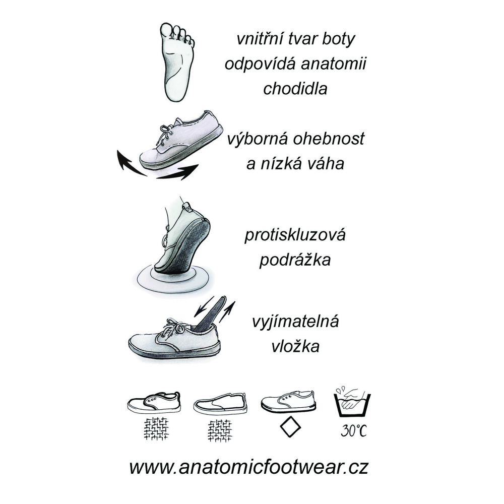 Barefootové papučky českej značky Anatomic sú ľahké a veľmi ohybné. Podrážka je z 3 mm kaučuku, a teda je protišmyková. Majú málinko pevnejšiu pätu. Sedia na normálne širokú až užšiu nôžku. Vďaka dobrému tvaru špičky sedia aj na dominantnejšie palčeky. Majú vyberateľnú, netvarovanú, koženú stielku.