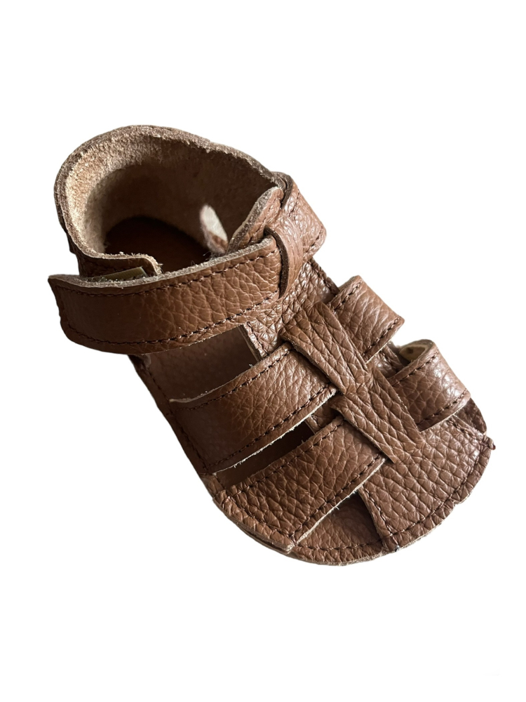 Barefoot sandále zo Slovenskej dielne značky Baby Bare. Sandálky majú prekrytú špičku, 3mm tenkú gumenú podrážku, pričom stielka aj zvršok sú vyrobené z kvalitnej kože. Sú naozaj ľahučké, bez spevnenej päty a ohybné priečne aj pozdĺžne. Anatomicky tvarovaná podrážka zabezpečuje dostatok miesta pre prsty a sú tiež vhodné pre dominantný palček. Vždy je potrebné sledovať, ako dieťatku sedia pri chôdzi. Sú vhodné na normálny a vyšší priehlavok. Značka sa vyznačuje jednoduchým, minimalistickým dizajnom, ktorý je ľahko kombinovateľný. Ide o sandálky, ktoré sa využívajú ako topánočky v lete, ale je možné ich nosiť celosezónne aj ako papučky. Sú vhodné pre prvochodcov a aj pre väčšie detičky.
