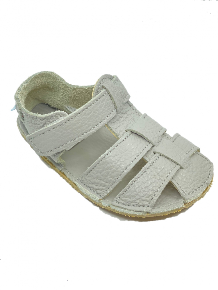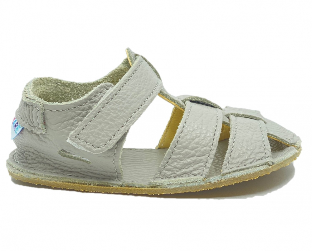 Barefoot sandále zo Slovenskej dielne značky Baby Bare. Sandálky majú prekrytú špičku, 3mm tenkú gumenú podrážku, pričom stielka aj zvršok sú vyrobené z kvalitnej kože. Sú naozaj ľahučké, bez spevnenej päty a ohybné priečne aj pozdĺžne. Anatomicky tvarovaná podrážka zabezpečuje dostatok miesta pre prsty a sú tiež vhodné pre dominantný palček. Vždy je potrebné sledovať, ako dieťatku sedia pri chôdzi. Sú vhodné na normálny a vyšší priehlavok. Značka sa vyznačuje jednoduchým, minimalistickým dizajnom, ktorý je ľahko kombinovateľný. Ide o sandálky, ktoré sa využívajú ako topánočky v lete, ale je možné ich nosiť celosezónne aj ako papučky. Sú vhodné pre prvochodcov a aj pre väčšie detičky.