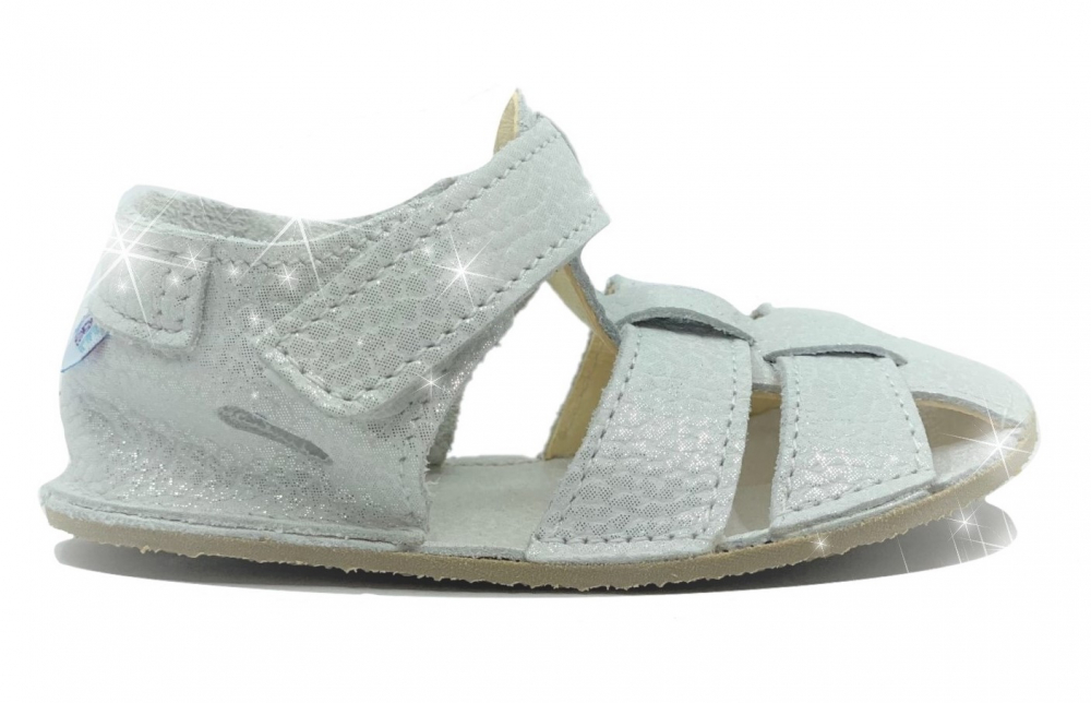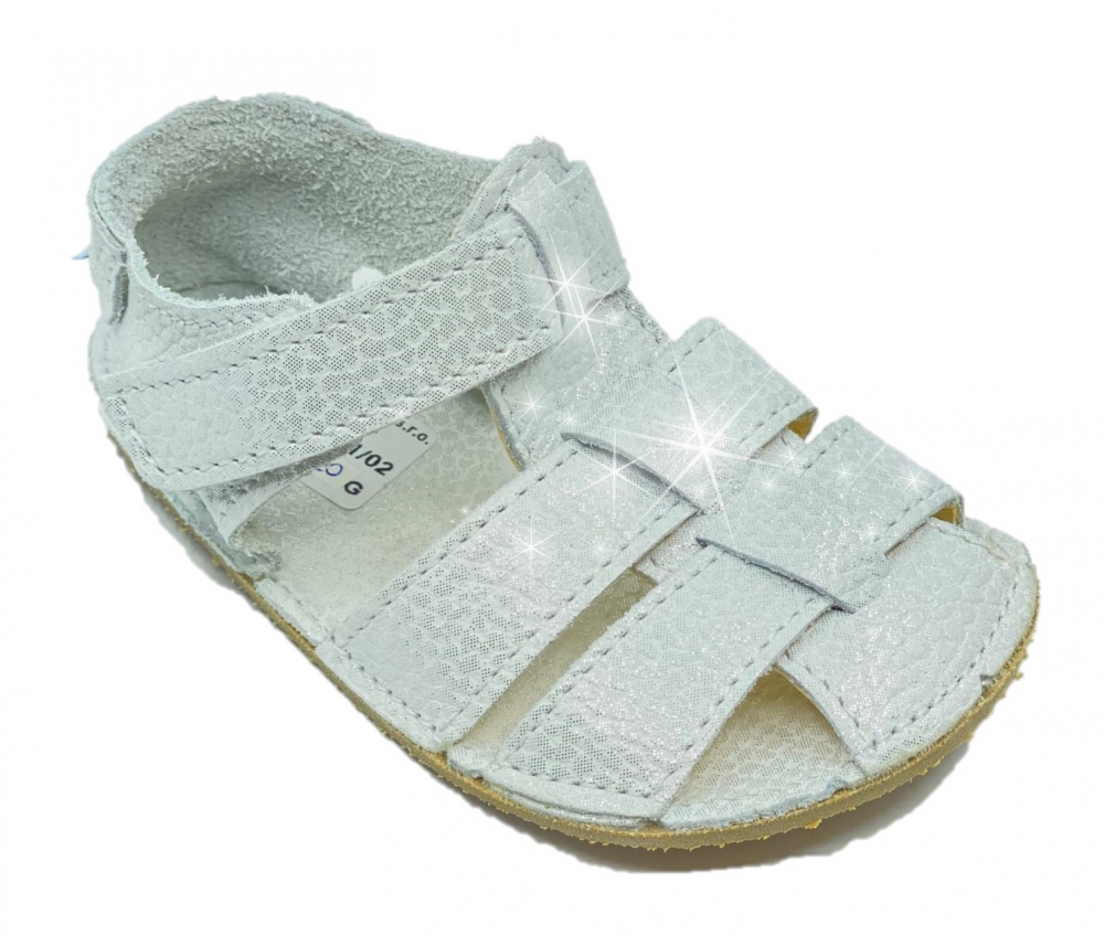 Barefoot sandále zo Slovenskej dielne značky Baby Bare. Sandálky majú prekrytú špičku, 3mm tenkú gumenú podrážku, pričom stielka aj zvršok sú vyrobené z kvalitnej kože. Sú naozaj ľahučké, bez spevnenej päty a ohybné priečne aj pozdĺžne. Anatomicky tvarovaná podrážka zabezpečuje dostatok miesta pre prsty a sú tiež vhodné pre dominantný palček. Vždy je potrebné sledovať, ako dieťatku sedia pri chôdzi. Sú vhodné na normálny a vyšší priehlavok. Značka sa vyznačuje jednoduchým, minimalistickým dizajnom, ktorý je ľahko kombinovateľný. Ide o sandálky, ktoré sa využívajú ako topánočky v lete, ale je možné ich nosiť celosezónne aj ako papučky. Sú vhodné pre prvochodcov a aj pre väčšie detičky. Model v prevedení PEARL je jemný, dievčenský s ligotavým, perleťovým povrchom. Topánočky tak možno využiť napríklad na príležitosť svadby či oslavy.