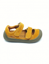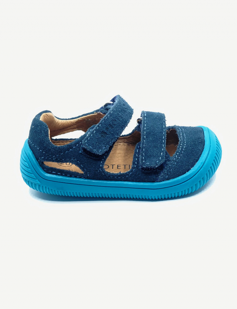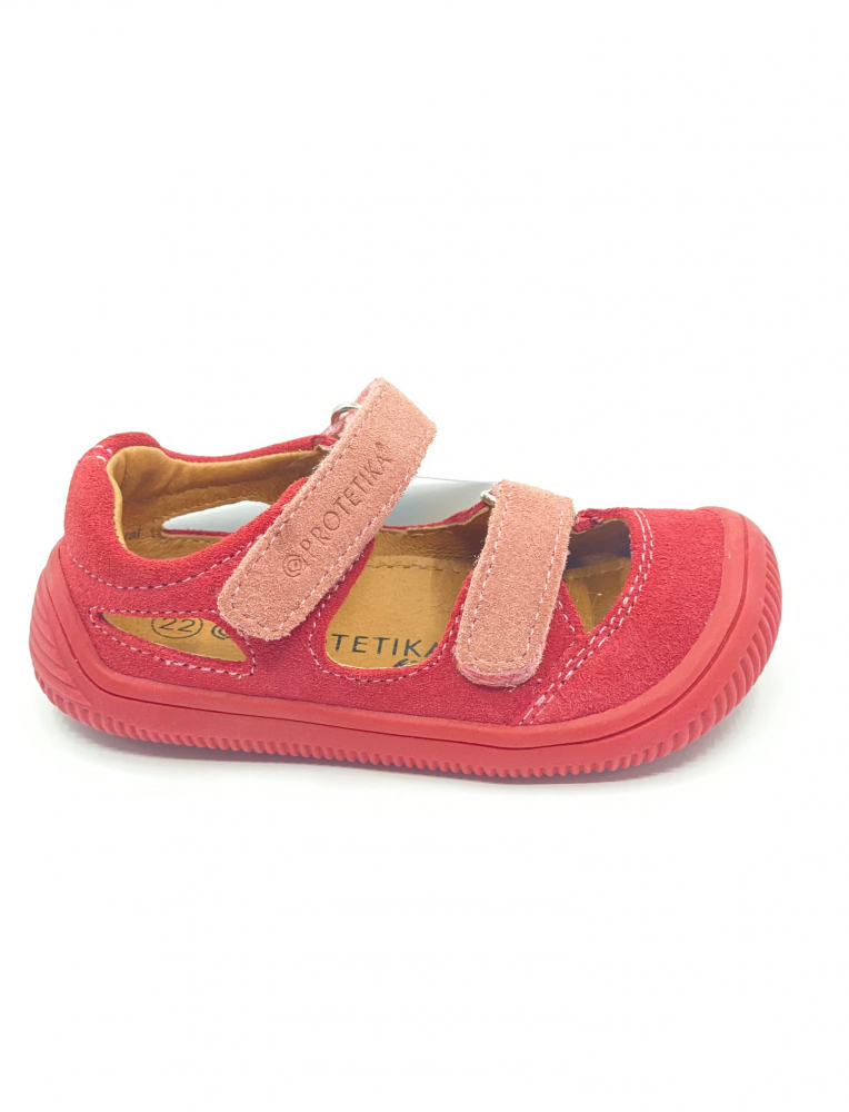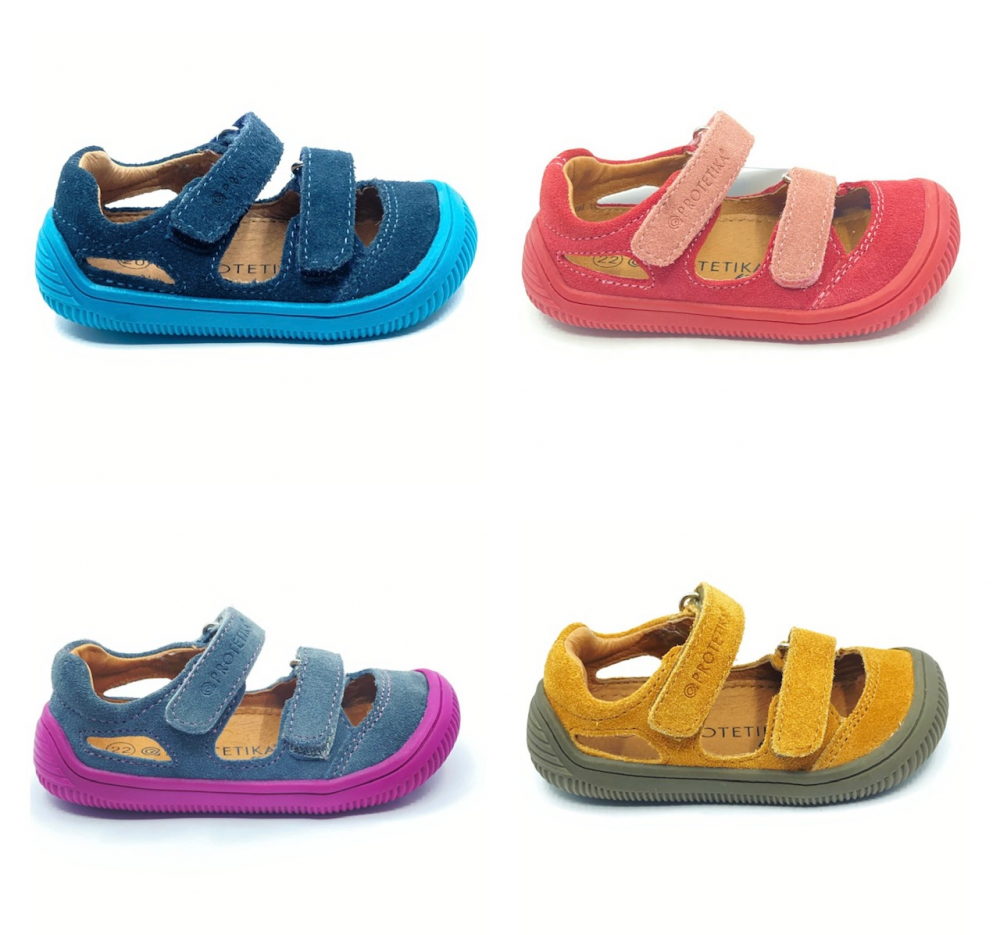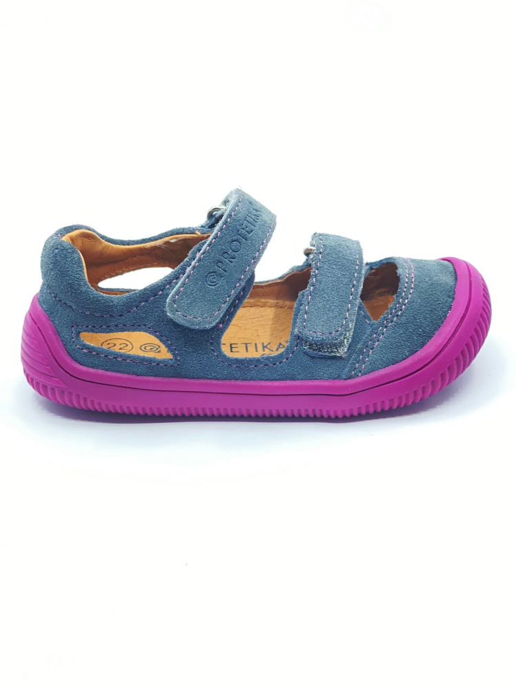 Barefootové sandálky z brúsenej kože od značky Protetika. Vďaka 2 suchým zipsom sa dajú dobre prispôsobiť nôžke. Stielka je vyberateľná a netvarovaná. Gumená špička slúži ako ochrana voči okopaniu. Sedia na normálne široké a užšie nôžky. Na veľmi úzke členky sa vo väčších veľkostiach nedajú dobre utiahnuť.