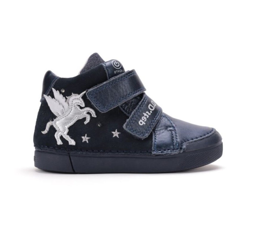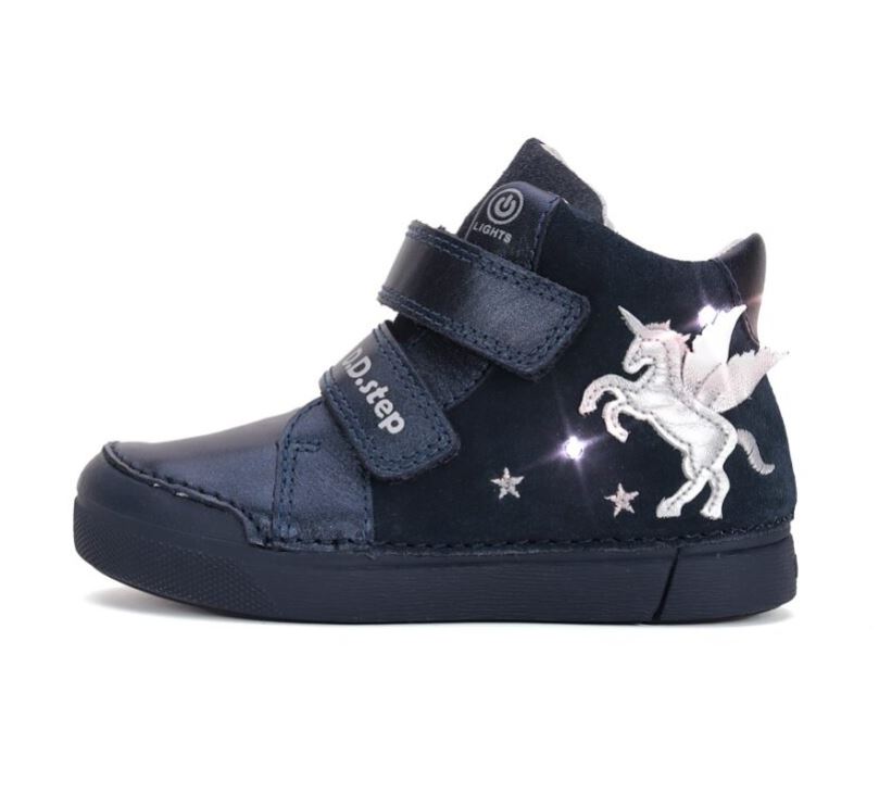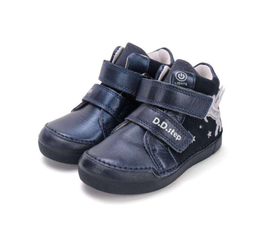 Vyššie celokožené tenisky od značky D.D.Step. Sedia na normálne široké aj širšie nôžky. Majú kožou potiahnutú, vyberateľnú stielku, ktorá je ortopedicky tvarovaná. Topánočky sa dajú pekne utiahnuť a prispôsobiť tak nôžkam, vďaka dvom suchým zipsom, čo je výhodou aj pre detičky s užšími členkami. Päta je spevnená, chráni nôžku pred nárazmi a poskytuje oporu. Topánočky majú veľmi praktickú pogumovanú špicu, ktorá slúži ako ochrana pred okopaním, vďaka čomu sa maximalizuje ich životnosť. Sú členkové, ideálne aj na sychravé jarné či jesenné počasie. Údržba a starostlivosť je jednoduchá, pri sychravom počasí ich stačí impregnovať a po ušpinení šetrne čistiť. Topánky pri chôdzi blikajú, čo možno považovať za reflexný prvok. Blikanie sa dá aj vypnúť vďaka gombíku, ktorý je na boku topánok.
