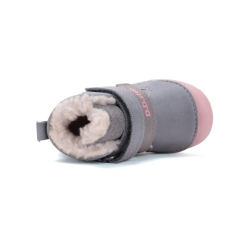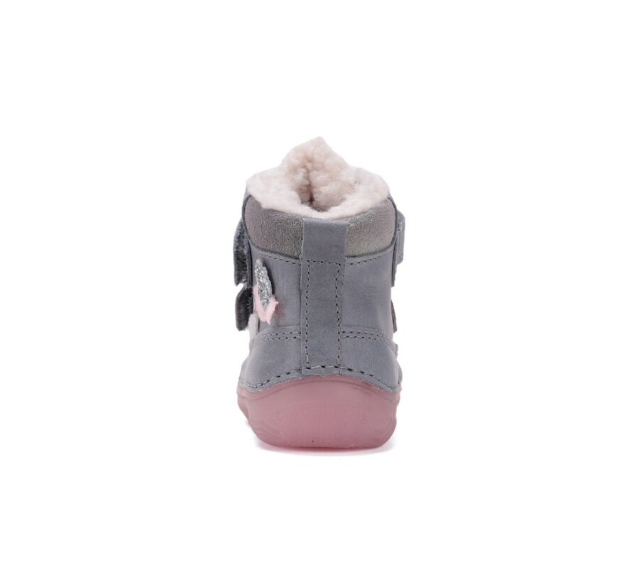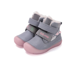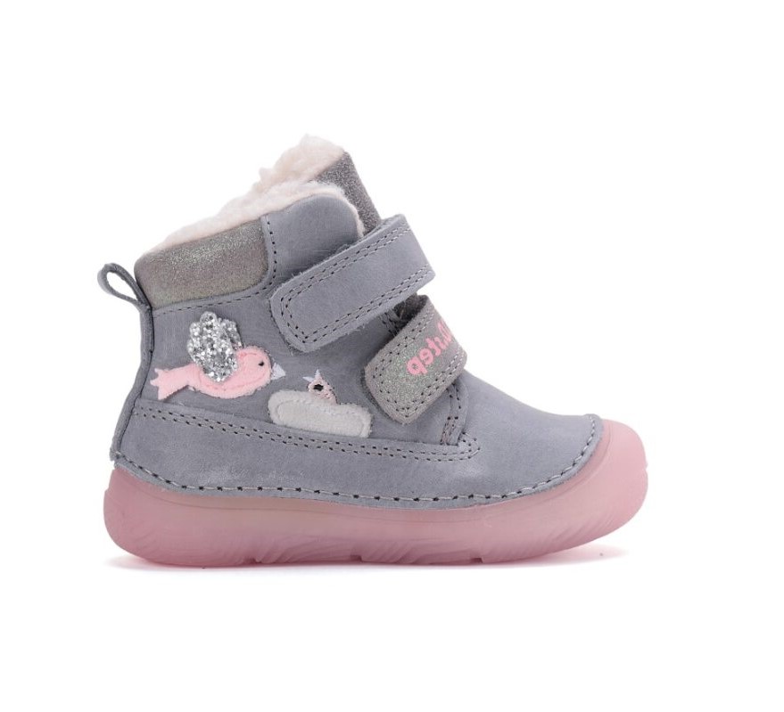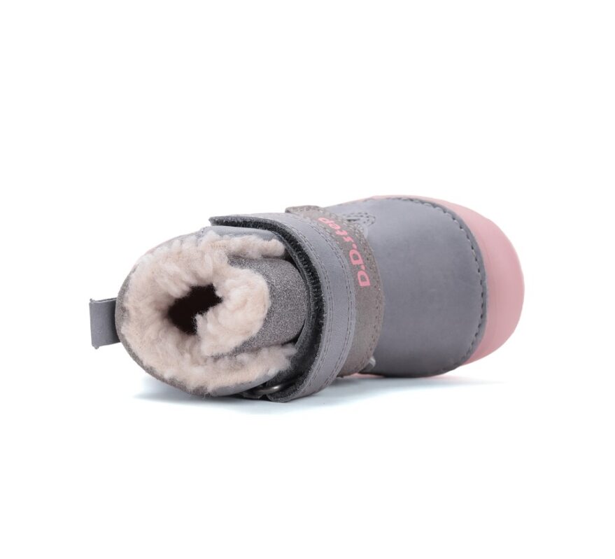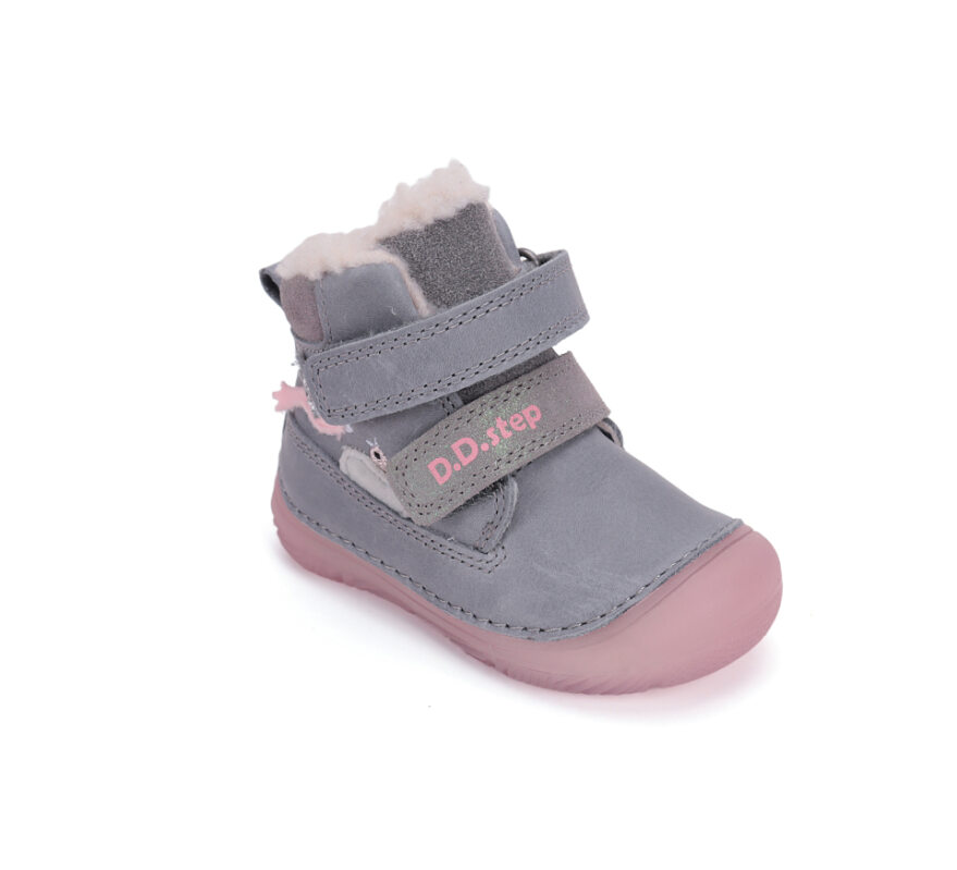 Celokožené topánky od značky D.D.Step s radou podrážky 082, ktorá je mäkká a flexibilná. Topánočky sú ohybné pozdĺžne aj priečne a zaguľatená špica poskytuje dostatok miesta pre prsty. Dajú sa pekne utiahnuť vďaka dvom suchým zipsom. Majú spevnenú pätovú oblasť. Sedia na normálne široké aj širšie nôžky. Topánky sú potiahnuté príjemnou, hrejivou kožušinkou. V topánkach sa nachádza vyberateľná, jemne tvarovaná stielka, ktorá je taktiež zateplená kožušinkou. Výhodou je najmä praktická pogumovaná špica, ktorá zabráni okopaniu. Údržba a starostlivosť o topánočky je jednoduchá, stačí ich impregnovať a pri ušpinení očistiť jemnou kefkou či vlhkou handričkou. Topánočky sú členkové, ideálne aj na sychravé jarné či jesenné počasie. Topánočky majú fosforujúcu podrážku v tme (viď. foto). Čo možno považovať za reflexný prvok.