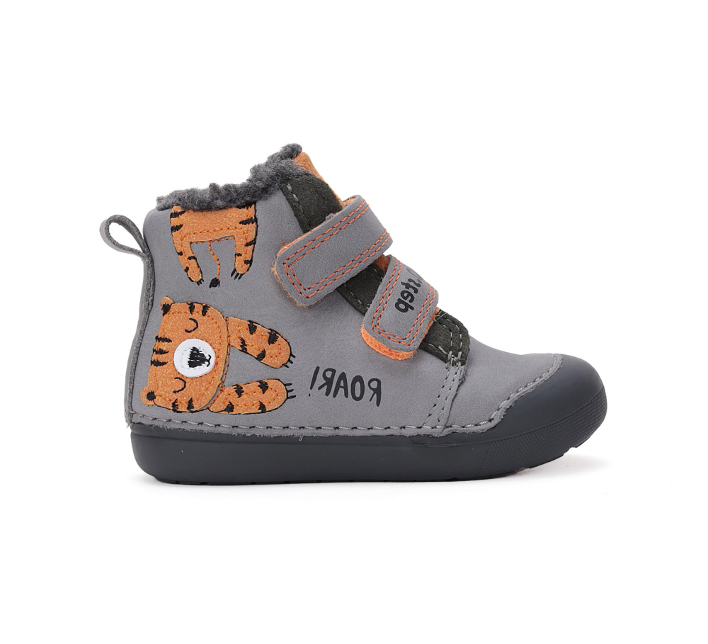 Vyššie, kožené topánočky od značky D.D.Step s radou podrážky 066, ktorá je považovaná za barefoot, teda Barefeet by D.D.Step. Majú mierne spevnenú pätu a podrážka je ohybná v oboch smeroch, pozdĺžne aj priečne. Sedia na normálne až širšie nôžky. Sú zateplené príjemnou, hrejivou kožušinou a dajú sa pekne pritiahnuť dvoma suchými zipsami, čo je výhodou aj pre detičky s užšími členkami. Vo vnútri sa nachádza vyberateľná, zateplená stielka, ktorá nie je tvarovaná. Výhodou je najmä praktická pogumovaná špica, ktorá zabráni okopaniu. Údržba a starostlivosť o topánočky je jednoduchá, stačí ich impregnovať.