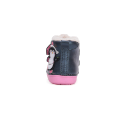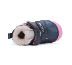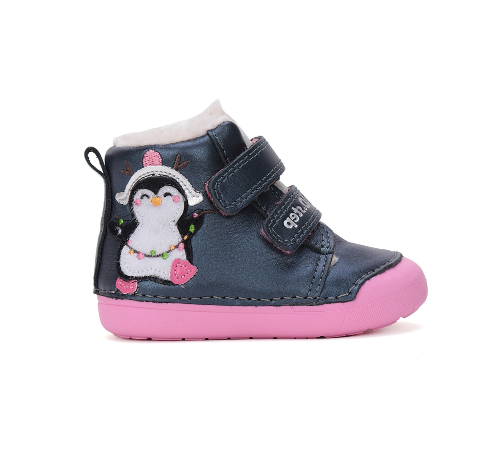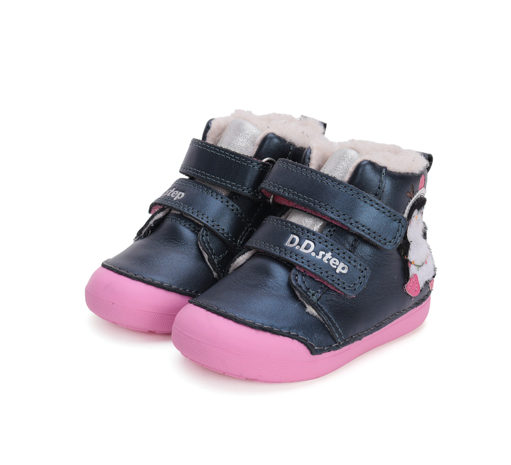 Vyššie, kožené topánočky od značky D.D.Step s radou podrážky 066, ktorá je považovaná za barefoot, teda Barefeet by D.D.Step. Majú mierne spevnenú pätu a podrážka je ohybná v oboch smeroch, pozdĺžne aj priečne. Sedia na normálne až širšie nôžky. Sú zateplené príjemnou, hrejivou kožušinou a dajú sa pekne pritiahnuť dvoma suchými zipsami, čo je výhodou aj pre detičky s užšími členkami. Vo vnútri sa nachádza vyberateľná, zateplená stielka, ktorá nie je tvarovaná. Výhodou je najmä praktická pogumovaná špica, ktorá zabráni okopaniu. Údržba a starostlivosť o topánočky je jednoduchá, stačí ich impregnovať.