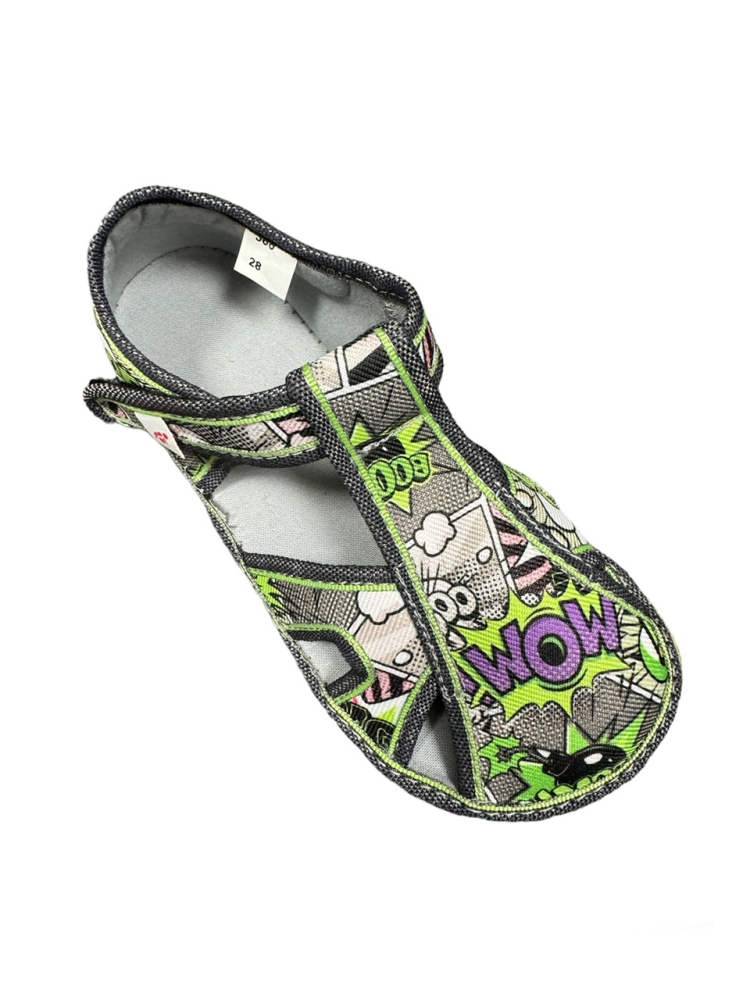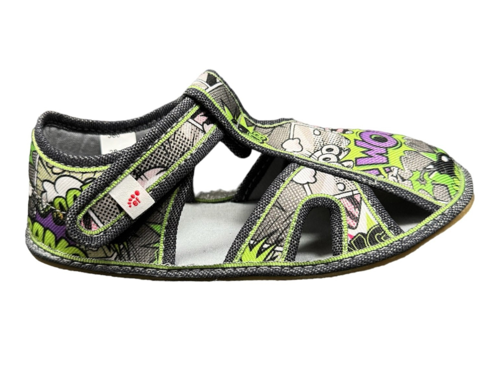 Polootvorené Barefoot papučky od značky EF sú veľmi ľahučké a ohybné pozdĺžne aj priečne. Zatvorená predná časť chráni prsty pred zakopnutím a zároveň poskytuje dostatok priestoru pre prsty. Papučky sú po bokoch otvorené, čo umožňuje vetranie nožičiek. Majú tenkú, gumenú 2 mm podrážku s nulovým dropom. Sedia na normálne široké až užšie nôžky a vďaka suchému zipsu sa dajú pekne utiahnuť aj na úzke členky. Rovná, vnútorná stielka nie je vyberateľná.