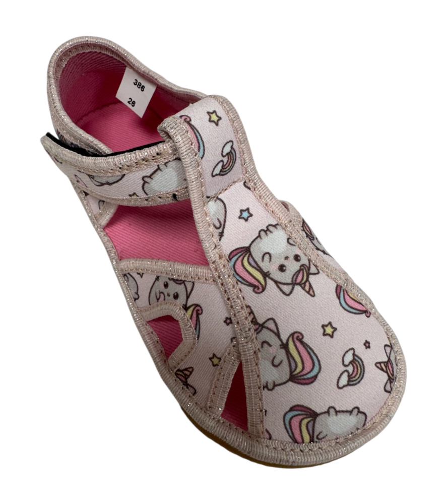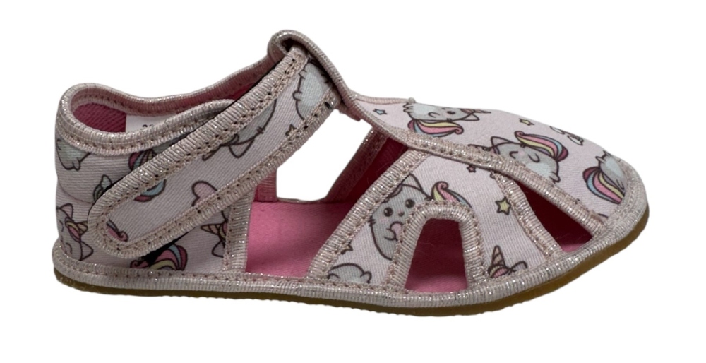 Polootvorené Barefoot papučky od značky EF sú veľmi ľahučké a ohybné pozdĺžne aj priečne. Zatvorená predná časť chráni prsty pred zakopnutím a zároveň poskytuje dostatok priestoru pre prsty. Papučky sú po bokoch otvorené, čo umožňuje vetranie nožičiek. Majú tenkú, gumenú 2 mm podrážku s nulovým dropom (medzi pätou a špičkou nie je výškovo žiaden rozdiel, podrážka je teda úplne plochá a chodidlo je rovnako vysoko od zeme v päte aj špičke). Sedia na normálne široké až užšie nôžky a vďaka suchému zipsu sa dajú pekne utiahnuť aj na úzke členky.