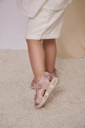 Ľahunké, štýlové sandále od dánskej značky EN*FANT s otvorenou špicou a pätou. Sedia na normálne širokú aj širšiu nôžku. Zapínajú sa na suché zipsy, ktoré dobre fixujú nohy v sandálach a sú maximálne prispôsobiteľné. Pri chôdzi tiež blikajú, čo možno považovať aj za reflexný prvok. EVA podrážka je super ľahká ohybná a tlmí nárazy pri chôdzi.