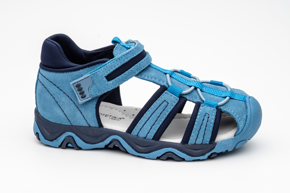 Kožené sandálky s uzatvorenou pätou aj špičkou od značky Protetika v športovom prevedení. Stielka je s ortopedicky tvarovanou klenbou. Sedia na normálne široké aj širšie nôžky. Sandálky sú prispôsobiteľné suchým zipsom. Je v nich dostatok miesta aj pre vyšší priehlavok. Sú mäkučké a veľmi pohodlné aj na celodenné nosenie. Výhodou je najmä praktická, vyvýšená, pogumovaná špica, ktorá chráni topánočky pred okopaním, čím sa predlžuje ich životnosť.