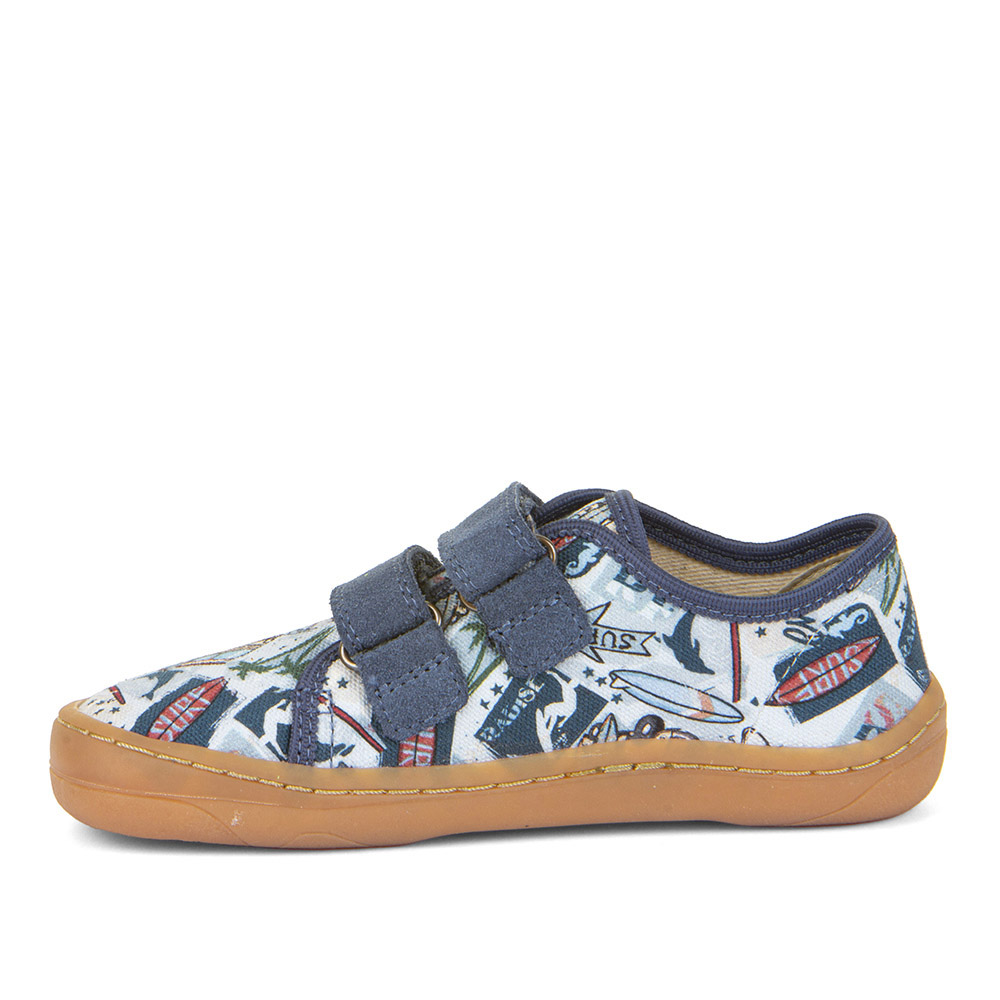 Barefootové plátené tenisky od chorvátskej značky FRODDO. Sú ľahké, kvalitne prepracované a poskytujú dostatočný priestor pre prsty. Špica je anatomicky tvarovaná, vhodná pre dominantný palček aj nôžky typu plutvička. Sedia na normálne široké aj širšie nohy a normálne vysoký priehlavok. Topánky majú tenkú a flexibilnú podrážku, ohybnú pozdĺžne aj priečne, sú extra pružné. Majú vyvýšenú pogumovanú špicu a pätu, ktorá ich chráni pred okopaním, čím sa predlžuje ich životnosť a odolnosť. Päta je mierne spevnená, pekne drží tvar. Gumená podrážka nosením jemne zmäkne, vďaka čomu budú plátenky ešte pohodlnejšie. Podošva je s nulovým dropom (medzi pätou a špičkou nie je výškovo žiaden rozdiel, podrážka je teda úplne plochá a chodidlo je rovnako vysoko od zeme v päte aj špičke). Nohy v topánkach upevňujú dva kožené suché zipsy, ktoré sa dajú pekne pritiahnuť aj k užším členkom. Vo vnútri sa nachádza plochá, vyberateľná, kožená stielka, ktorá je antibakteriálna. Textilný zvršok zabezpečuje nožičkám priedušnosť a činí topánočky ľahkými a vzdušnými. Údržba a starostlivosť o topánočky je jednoduchá, pri ušpinení stačí šetrne očistiť. Ak impregnujete, odporúčame použiť prostriedok určený na textilné povrchy, ideálne s UV filtrami, vďaka ktorým si textília dlho zachová stálosť farby.