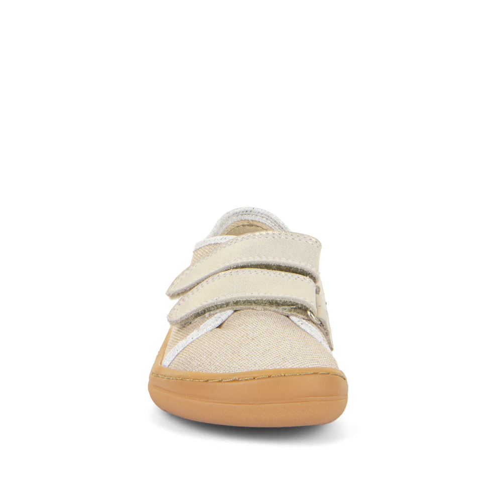 Barefootové plátené tenisky od chorvátskej značky FRODDO. Sú ľahké, kvalitne prepracované a poskytujú dostatočný priestor pre prsty. Zaujímavé sú svojím trblietavým prevedením. Špica je anatomicky tvarovaná, vhodná pre dominantný palček aj nôžky typu plutvička. Sedia na normálne široké aj širšie nohy a normálne vysoký priehlavok. Topánky majú tenkú a flexibilnú podrážku, ohybnú pozdĺžne aj priečne, sú extra pružné. Majú vyvýšenú pogumovanú špicu a pätu, ktorá ich chráni pred okopaním, čím sa predlžuje ich životnosť a odolnosť. Päta je mierne spevnená, pekne drží tvar. Gumená podrážka nosením jemne zmäkne, vďaka čomu budú plátenky ešte pohodlnejšie. Podošva je s nulovým dropom (medzi pätou a špičkou nie je výškovo žiaden rozdiel, podrážka je teda úplne plochá a chodidlo je rovnako vysoko od zeme v päte aj špičke). Nohy v topánkach upevňujú dva kožené suché zipsy, ktoré sa dajú pekne pritiahnuť aj k užším členkom, taktiež sú so zlatými odleskami. Vo vnútri sa nachádza plochá, vyberateľná, kožená stielka, ktorá je antibakteriálna. Textilný zvršok zabezpečuje nožičkám priedušnosť a činí topánočky ľahkými a vzdušnými. Údržba a starostlivosť o topánočky je jednoduchá, pri ušpinení stačí šetrne očistiť. Ak impregnujete, odporúčame použiť prostriedok určený na textilné povrchy, ideálne s UV filtrami, vďaka ktorým si textília dlho zachová stálosť farby.