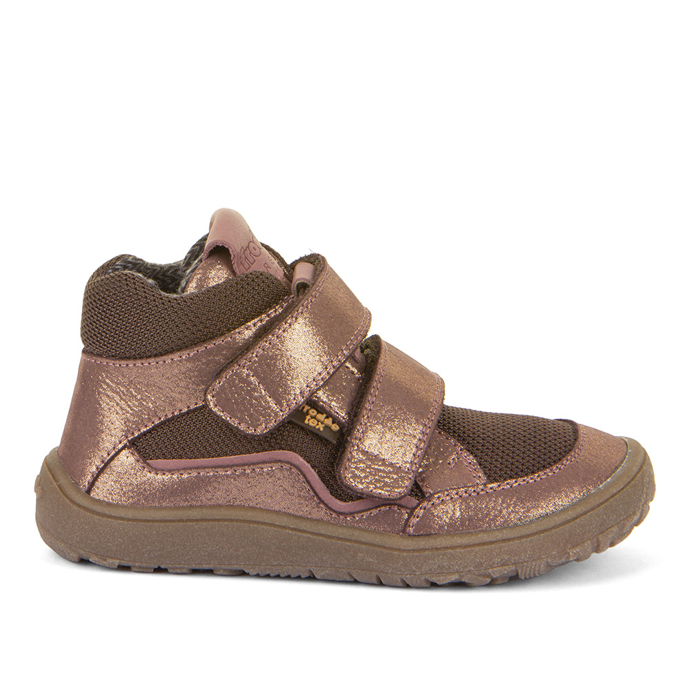 Barefootové celokožené topánky od chorvátskej značky FRODDO s nepremokavou Froddo-tex membránou,ktorá ochráni topánočky bez dodatočnej impregnácie pred dažďom, snehom a vlhkosťou. Sú ľahké, kvalitne prepracované a poskytujú dostatočný priestor pre prsty. Špica je anatomicky tvarovaná, vhodná pre dominantný palček aj nôžky typu plutvička. Sedia na normálne široké nohy a normálne vysoký priehlavok. Topánky majú tenkú a flexibilnú podrážku, ohybnú pozdĺžne aj priečne. Majú vyvýšenú pogumovanú špicu a pätu, ktorá ich chráni pred okopaním, čím sa predlžuje ich životnosť a odolnosť. Päta je mierne spevnená, pekne drží tvar. Podrážka nosením jemne zmäkne, vďaka čomu budú topánky ešte pohodlnejšie, je tiež protišmyková (extra grip), s podošvou s nulovým dropom (medzi pätou a špičkou nie je výškovo žiaden rozdiel, podrážka je teda úplne plochá a chodidlo je rovnako vysoko od zeme v päte aj špičke). Nohy v topánkach upevňujú dva suché zipsy, ktoré sa dajú pekne pritiahnuť aj k užším členkom. Vo vnútri sa nachádza plochá, vyberateľná, kožená stielka, ktorá je antibakteriálna.