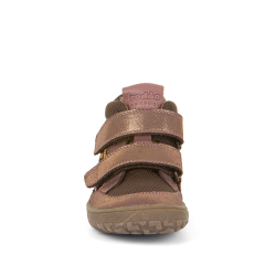 Barefootové celokožené topánky od chorvátskej značky FRODDO s nepremokavou Froddo-tex membránou,ktorá ochráni topánočky bez dodatočnej impregnácie pred dažďom, snehom a vlhkosťou. Sú ľahké, kvalitne prepracované a poskytujú dostatočný priestor pre prsty. Špica je anatomicky tvarovaná, vhodná pre dominantný palček aj nôžky typu plutvička. Sedia na normálne široké nohy a normálne vysoký priehlavok. Topánky majú tenkú a flexibilnú podrážku, ohybnú pozdĺžne aj priečne. Majú vyvýšenú pogumovanú špicu a pätu, ktorá ich chráni pred okopaním, čím sa predlžuje ich životnosť a odolnosť. Päta je mierne spevnená, pekne drží tvar. Podrážka nosením jemne zmäkne, vďaka čomu budú topánky ešte pohodlnejšie, je tiež protišmyková (extra grip), s podošvou s nulovým dropom (medzi pätou a špičkou nie je výškovo žiaden rozdiel, podrážka je teda úplne plochá a chodidlo je rovnako vysoko od zeme v päte aj špičke). Nohy v topánkach upevňujú dva suché zipsy, ktoré sa dajú pekne pritiahnuť aj k užším členkom. Vo vnútri sa nachádza plochá, vyberateľná, kožená stielka, ktorá je antibakteriálna.