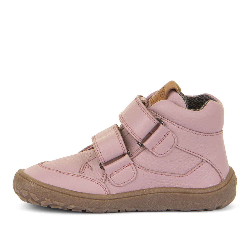 Barefootové celokožené topánky od chorvátskej značky FRODDO s nepremokavou Froddo-tex membránou,ktorá ochráni topánočky bez dodatočnej impregnácie pred dažďom, snehom a vlhkosťou. Sú ľahké, kvalitne prepracované a poskytujú dostatočný priestor pre prsty. Špica je anatomicky tvarovaná, vhodná pre dominantný palček aj nôžky typu plutvička. Sedia na normálne široké nohy a normálne vysoký priehlavok. Topánky majú tenkú a flexibilnú podrážku, ohybnú pozdĺžne aj priečne. Majú vyvýšenú pogumovanú špicu a pätu, ktorá ich chráni pred okopaním, čím sa predlžuje ich životnosť a odolnosť. Päta je mierne spevnená, pekne drží tvar. Podrážka nosením jemne zmäkne, vďaka čomu budú topánky ešte pohodlnejšie, je tiež protišmyková (extra grip), s podošvou s nulovým dropom (medzi pätou a špičkou nie je výškovo žiaden rozdiel, podrážka je teda úplne plochá a chodidlo je rovnako vysoko od zeme v päte aj špičke). Nohy v topánkach upevňujú dva suché zipsy, ktoré sa dajú pekne pritiahnuť aj k užším členkom. Vo vnútri sa nachádza plochá, vyberateľná, kožená stielka, ktorá je antibakteriálna.