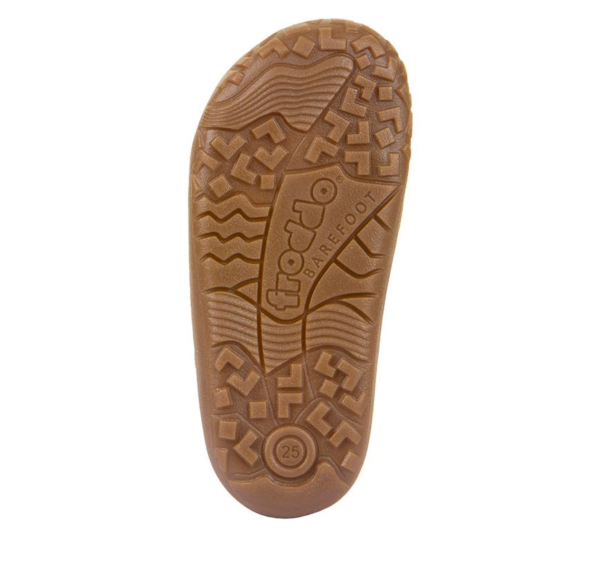 Barefootové celokožené topánky od chorvátskej značky FRODDO s nepremokavou Froddo-tex membránou,ktorá ochráni topánočky bez dodatočnej impregnácie pred dažďom, snehom a vlhkosťou. Sú ľahké, kvalitne prepracované a poskytujú dostatočný priestor pre prsty. Špica je anatomicky tvarovaná, vhodná pre dominantný palček aj nôžky typu plutvička. Sedia na normálne široké nohy a normálne vysoký priehlavok. Topánky majú tenkú a flexibilnú podrážku, ohybnú pozdĺžne aj priečne. Majú vyvýšenú pogumovanú špicu a pätu, ktorá ich chráni pred okopaním, čím sa predlžuje ich životnosť a odolnosť. Päta je mierne spevnená, pekne drží tvar. Podrážka nosením jemne zmäkne, vďaka čomu budú topánky ešte pohodlnejšie, je tiež protišmyková (extra grip), s podošvou s nulovým dropom (medzi pätou a špičkou nie je výškovo žiaden rozdiel, podrážka je teda úplne plochá a chodidlo je rovnako vysoko od zeme v päte aj špičke). Nohy v topánkach upevňujú dva suché zipsy, ktoré sa dajú pekne pritiahnuť aj k užším členkom. Vo vnútri sa nachádza plochá, vyberateľná, kožená stielka, ktorá je antibakteriálna.