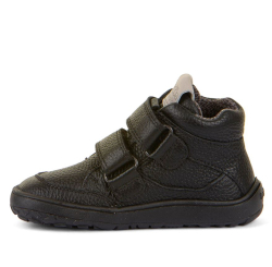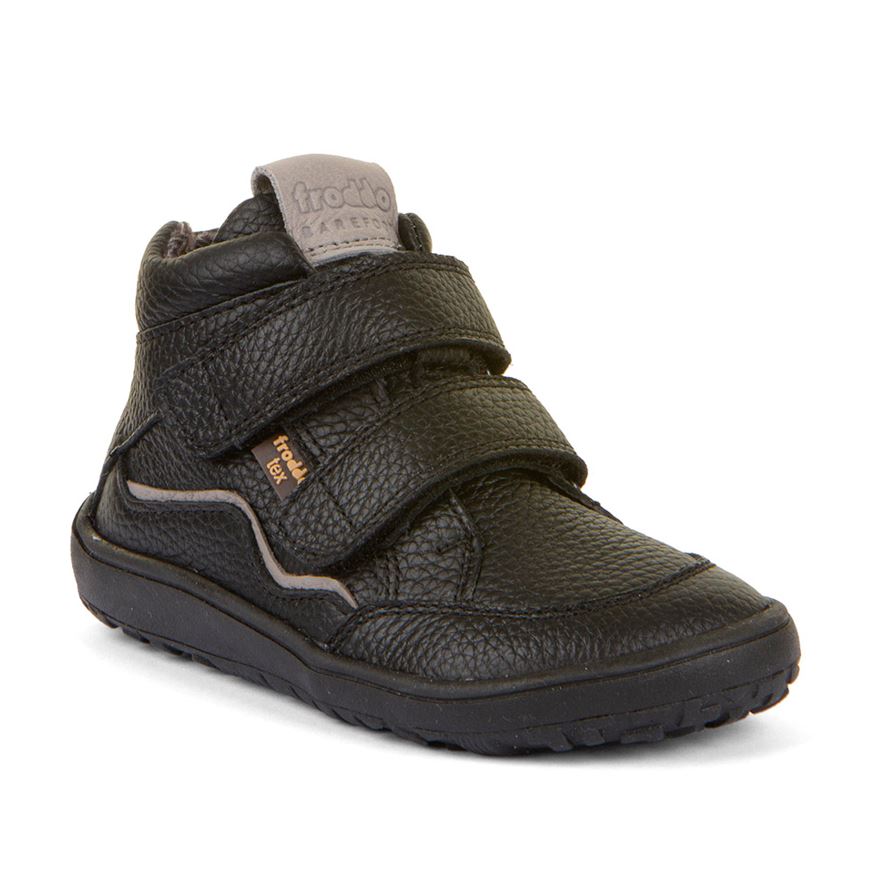 Barefootové celokožené topánky od chorvátskej značky FRODDO s nepremokavou Froddo-tex membránou,ktorá ochráni topánočky bez dodatočnej impregnácie pred dažďom, snehom a vlhkosťou. Sú ľahké, kvalitne prepracované a poskytujú dostatočný priestor pre prsty. Špica je anatomicky tvarovaná, vhodná pre dominantný palček aj nôžky typu plutvička. Sedia na normálne široké nohy a normálne vysoký priehlavok. Topánky majú tenkú a flexibilnú podrážku, ohybnú pozdĺžne aj priečne. Majú vyvýšenú pogumovanú špicu a pätu, ktorá ich chráni pred okopaním, čím sa predlžuje ich životnosť a odolnosť. Päta je mierne spevnená, pekne drží tvar. Podrážka nosením jemne zmäkne, vďaka čomu budú topánky ešte pohodlnejšie, je tiež protišmyková (extra grip), s podošvou s nulovým dropom (medzi pätou a špičkou nie je výškovo žiaden rozdiel, podrážka je teda úplne plochá a chodidlo je rovnako vysoko od zeme v päte aj špičke). Nohy v topánkach upevňujú dva suché zipsy, ktoré sa dajú pekne pritiahnuť aj k užším členkom. Vo vnútri sa nachádza plochá, vyberateľná, kožená stielka, ktorá je antibakteriálna.