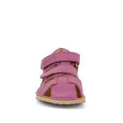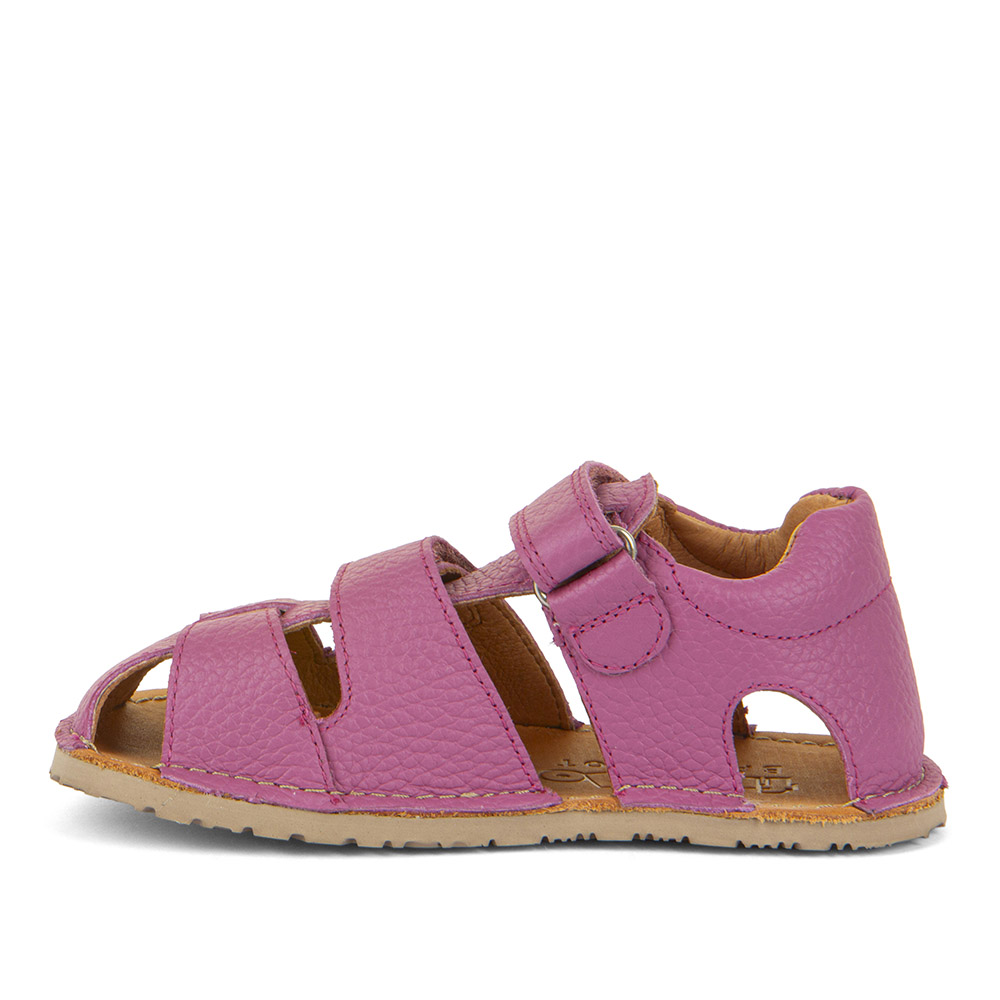 Barefootové sandálky od chorvátskej značky FRODDO so zatvorenou pätou a špicou. Sú ľahké, kvalitne prepracované a poskytujú dostatočný priestor pre prsty. Špica je anatomicky tvarovaná, vhodná pre dominantný palček aj nôžky typu plutvička. Sedia na normálne široké až širšie nohy, normálne vysoký a aj vyšší priehlavok. Topánky majú tenkú a flexibilnú podrážku, ohybnú pozdĺžne aj priečne. Podrážka je protišmyková s podošvou s nulovým dropom (medzi pätou a špičkou nie je výškovo žiaden rozdiel, podrážka je teda úplne plochá a chodidlo je rovnako vysoko od zeme v päte aj špičke). Zapínajú sa na suchý zips, ktorý sa nachádza okolo členku a tiež na priehlavkovej časti sandál. Topánočky sa tak perfektne prispôsobia nôžkam. Vo vnútri sa nachádza plochá, kožená stielka bez podpory klenby.