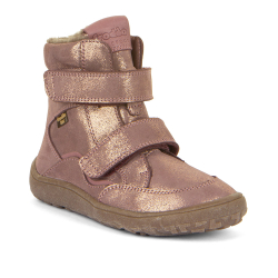 Barefootové celokožené topánky zateplené ovčou vlnou od chorvátskej značky FRODDO s nepremokavou Froddo-tex membránou, ktorá ochráni topánočky bez dodatočnej impregnácie pred dažďom, snehom a vlhkosťou. Sú ľahké, kvalitne prepracované a poskytujú dostatočný priestor pre prsty. Špica je anatomicky tvarovaná, vhodná pre dominantný palček aj nôžky typu plutvička. Sedia na normálne široké nohy a normálne vysoký priehlavok. Topánky majú tenkú a flexibilnú podrážku, ohybnú pozdĺžne aj priečne. Majú vyvýšenú pogumovanú špicu a pätu, ktorá ich chráni pred okopaním, čím sa predlžuje ich životnosť a odolnosť. Päta je mierne spevnená, pekne drží tvar. Podrážka nosením jemne zmäkne, vďaka čomu budú topánky ešte pohodlnejšie, je tiež protišmyková (extra grip), s podošvou s nulovým dropom (medzi pätou a špičkou nie je výškovo žiaden rozdiel, podrážka je teda úplne plochá a chodidlo je rovnako vysoko od zeme v päte aj špičke). Nohy v topánkach upevňujú dva suché zipsy, ktoré sa dajú pekne pritiahnuť aj k užším členkom. Ich vnútorné zateplenie z ovčej vlny ich činí hrejivými a sú tak ideálne na studené zimné obdobie. Vo vnútri sa nachádza zateplená, netvarovaná stielka.Údržba a starostlivosť o topánočky je jednoduchá, pri ušpinení stačí šetrne očistiť a v prípade používania impregnačných prostriedkov určených pre ochranu pred zašpinením, treba použiť impregnačný prostriedok výhradne určený na topánky s membránami.