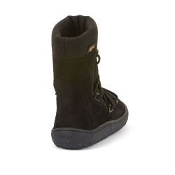 Barefootové topánky zateplené ovčou vlnou od chorvátskej značky FRODDO s nepremokavou Froddo-tex membránou, ktorá ochráni topánočky bez dodatočnej impregnácie pred dažďom, snehom a vlhkosťou. Sú ľahké, kvalitne prepracované a poskytujú dostatočný priestor pre prsty. Špica je anatomicky tvarovaná, vhodná pre dominantný palček aj nôžky typu plutvička. Sedia na normálne široké nohy a normálne vysoký priehlavok. Topánky majú tenkú a flexibilnú podrážku, ohybnú pozdĺžne aj priečne. Majú vyvýšenú pogumovanú špicu a pätu, ktorá ich chráni pred okopaním, čím sa predlžuje ich životnosť a odolnosť. Päta je mierne spevnená, pekne drží tvar. Podrážka nosením jemne zmäkne, vďaka čomu budú topánky ešte pohodlnejšie, je tiež protišmyková (extra grip), s podošvou s nulovým dropom (medzi pätou a špičkou nie je výškovo žiaden rozdiel, podrážka je teda úplne plochá a chodidlo je rovnako vysoko od zeme v päte aj špičke). Nohy v topánkach upevňuje elastická šnurovačka s brzdičkou, ktorá sa dá pekne pritiahnuť. Ich vnútorné zateplenie z ovčej vlny ich činí hrejivými a sú tak ideálne na studené zimné obdobie. Vo vnútri sa nachádza zateplená, netvarovaná stielka.Údržba a starostlivosť o topánočky je jednoduchá, pri ušpinení stačí šetrne očistiť a v prípade používania impregnačných prostriedkov určených pre ochranu pred zašpinením, treba použiť impregnačný prostriedok výhradne určený na topánky s membránami.