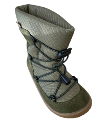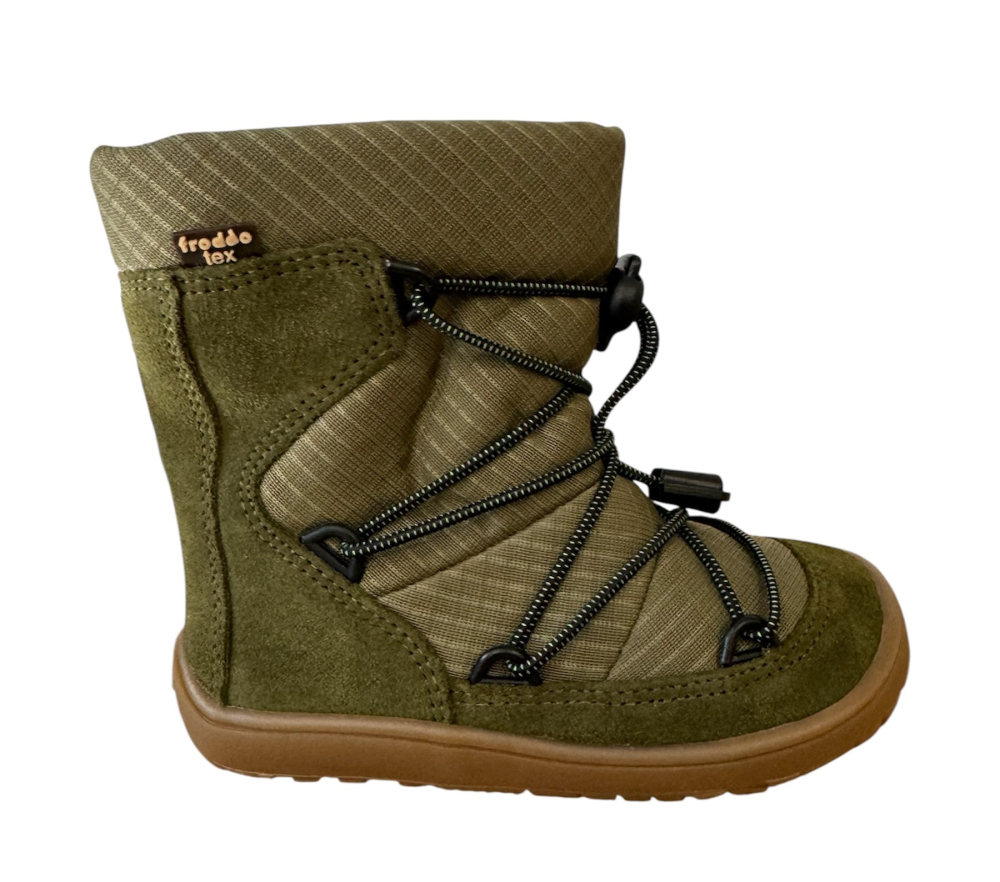 Barefootové topánky zateplené ovčou vlnou od chorvátskej značky FRODDO s nepremokavou Froddo-tex membránou, ktorá ochráni topánočky bez dodatočnej impregnácie pred dažďom, snehom a vlhkosťou. Sú ľahké, kvalitne prepracované a poskytujú dostatočný priestor pre prsty. Špica je anatomicky tvarovaná, vhodná pre dominantný palček aj nôžky typu plutvička. Sedia na normálne široké nohy a normálne vysoký priehlavok. Topánky majú tenkú a flexibilnú podrážku, ohybnú pozdĺžne aj priečne. Majú vyvýšenú pogumovanú špicu a pätu, ktorá ich chráni pred okopaním, čím sa predlžuje ich životnosť a odolnosť. Päta je mierne spevnená, pekne drží tvar. Podrážka nosením jemne zmäkne, vďaka čomu budú topánky ešte pohodlnejšie, je tiež protišmyková (extra grip), s podošvou s nulovým dropom (medzi pätou a špičkou nie je výškovo žiaden rozdiel, podrážka je teda úplne plochá a chodidlo je rovnako vysoko od zeme v päte aj špičke). Nohy v topánkach upevňuje elastická šnurovačka s brzdičkou, ktorá sa dá pekne pritiahnuť. Ich vnútorné zateplenie z ovčej vlny ich činí hrejivými a sú tak ideálne na studené zimné obdobie. Vo vnútri sa nachádza zateplená, netvarovaná stielka. Údržba a starostlivosť o topánočky je jednoduchá, pri ušpinení stačí šetrne očistiť a v prípade používania impregnačných prostriedkov určených pre ochranu pred zašpinením, treba použiť impregnačný prostriedok výhradne určený na topánky s membránami.