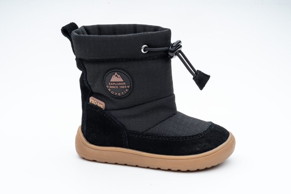 Barefootové vyššie topánky od značky Protetika s nepremokavou Pro-tex membránou. Pro-tex membrána chráni nôžky v topánkach pred dažďom, snehom a vlhkosťou, bez nutnosti impregnácie. Topánočky sú flexibilné, ohybné v oboch smeroch, pozdĺžne aj priečne. Sú ľahké a poskytujú dostatočný priestor pre prsty. Špica je anatomicky tvarovaná, vhodná aj pre dominantný palček. Sedia na normálne široké nôžky a znesú aj vyšší priehlavok. Nohy v topánkach upevňuje elastická gumička, ktorá sa dá pekne pritiahnuť ku členkom, čo je výhodou najmä pre detičky s užšími členkami. Vnútro topánok je vystlané teplou, syntetickou kožušinkou. Vyberateľná stielka je zateplená, netvarovaná. Topánky majú vyvýšenú pogumovanú špicu a pätu, ktorá ich chráni pred okopaním, čím sa predlžuje ich životnosť. Údržba je jednoduchá, pri ušpinení stačí šetrne očistiť . Ak by ste sa predsa len rozhodli ich naimpregnovať, pre jednoduchšiu údržbu a ochranu pred zašpinením, tak použite impregnačný prostriedok určený na membrány.