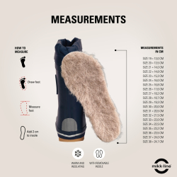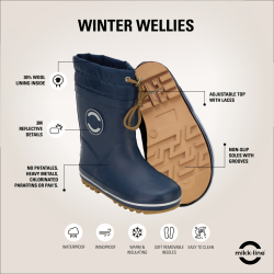 Zateplené gumené čižmy dánskej značky Mikk-line v štýlovom minimalistickom prevedení s nádhernou farebnou škálou. Sú mäkké, ohybné, dobre sedia na nohe a ľahko sa obúvajú. Sú vhodné pre normálne široké aj širšie nôžky a znesú aj vyšší priehlavok. Vďaka anatomicky tvarovanej špičke poskytujú dostatok miesta pre prsty. Sú vyrobené z prírodnej gumy a majú protišmykovú podrážku. Vo vnútri sa nachádzajú zateplené, netvarované, vyberateľné stielky, ktoré sú zo spodnej strany potiahnuté hlinníkovou fóliou. Vďaka tomu udržujú teplo. Zadná pätová časť a logo v bočnej časti obsahuje reflexný prvok, ktorý pekne vynikne v tme a zabezpečuje tak väčšiu bezpečnosť detí. Päta je mierne spevnená. Vnútro je zateplené vlnenou zmesou, takže udrží nôžky v teple počas chladnejších, sychravých dní. Výhodou je aj vrchné lemovanie s uťahovacím patentom, ktorým si možno gumáky dobre dotiahnuť k nôžkam a teplo tak z čižiem neuniká. Údržba a starostlivosť o gumáky je jednoduchá, po ušpinení ich stačí šetrne očistiť vlhkou handričkou. Nie sú vhodné na pranie v práčke a tiež sušenie v blízkosti silnejšieho zdroja tepla.