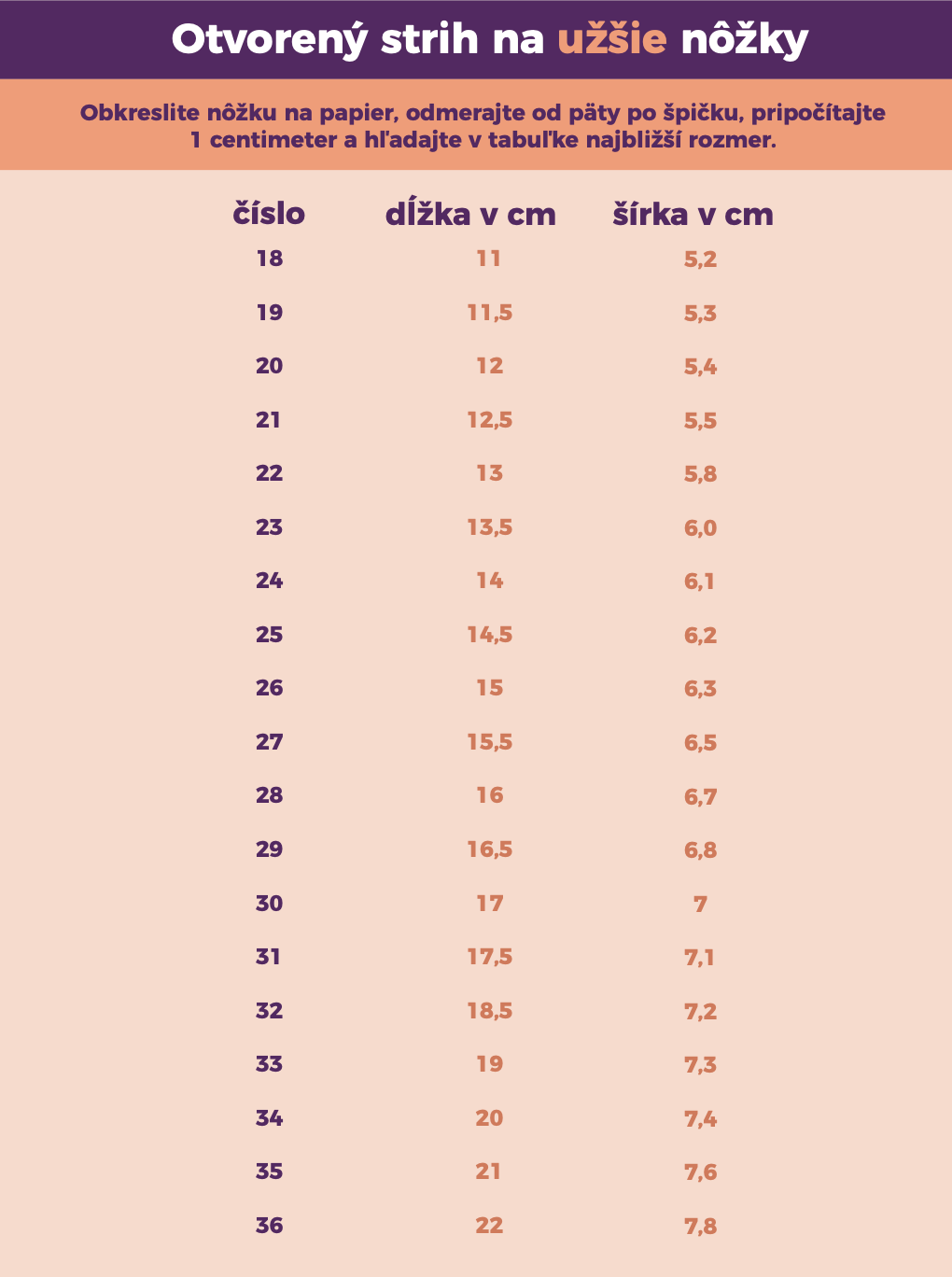 Pri objednávaní papučiek určite odporúčame riadiť sa veľkostnou tabuľkou pretože v porovnaní s bežným číslovaním sú podstatne menšie (obkreslite dieťatku nohu v stoji tenkou ceruzkou, odmerajte od päty k špičke, pripočítajte 0,5 - 1 cm nadmerok a výsledný rozmer nájdite v tabuľke).