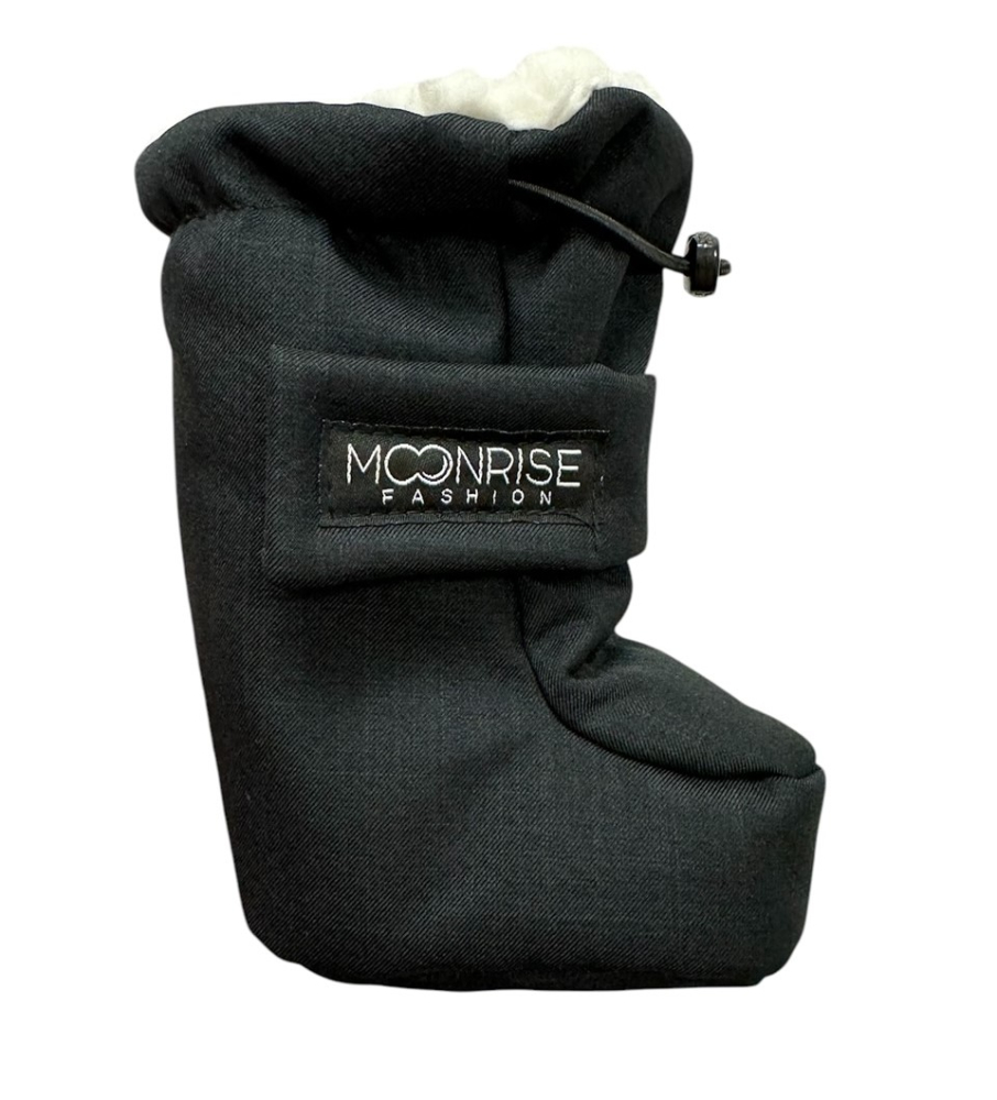 Nepremokavé sofshellové topánočky od slovenskej značky Moonrise Fashion v štýlovom čiernom prevedení. Sú maximálne ohybné, zapínajú sa suchým zipsom a dajú sa tiež dobre dotiahnuť gumičkou na prednej strane návlekov, takže sa perfektne prispôsobia všetkým nôžkam. Sú ideálne na chladné zimné obdobie do kočíka alebo nosiča. Zateplené vnútro udrží nôžky v teple a pohodlí vďaka príjemnému, mäkučkému materiálu. Pružný, nepremokavý softshell zasa ochráni pred vlhkom a dažďom. Pozor, nejedná sa však o topánočky na bežné chodenie, neodporúčame na asfalt a betón.