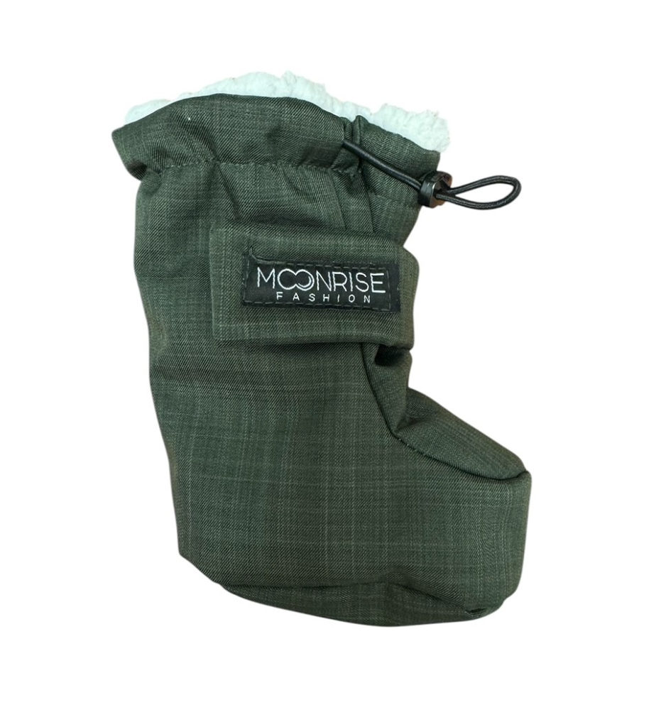 Nepremokavé sofshellové topánočky od slovenskej značky Moonrise Fashion v štýlovom khaki prevedení. Sú maximálne ohybné, zapínajú sa suchým zipsom a dajú sa tiež dobre dotiahnuť gumičkou na prednej strane návlekov, takže sa perfektne prispôsobia všetkým nôžkam. Sú ideálne na chladné zimné obdobie do kočíka alebo nosiča. Zateplené vnútro udrží nôžky v teple a pohodlí vďaka príjemnému, mäkučkému materiálu. Pružný, nepremokavý softshell zasa ochráni pred vlhkom a dažďom. Pozor, nejedná sa však o topánočky na bežné chodenie, neodporúčame na asfalt a betón.